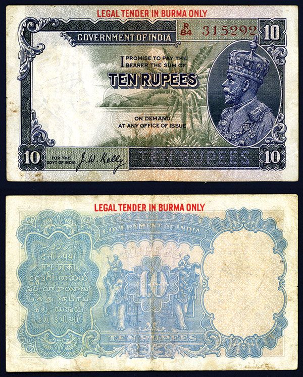 Burma, issued note, 10 Rupees, ND (1937), P-2a, PMG 35 Choice VF Staple Holes at Issue.