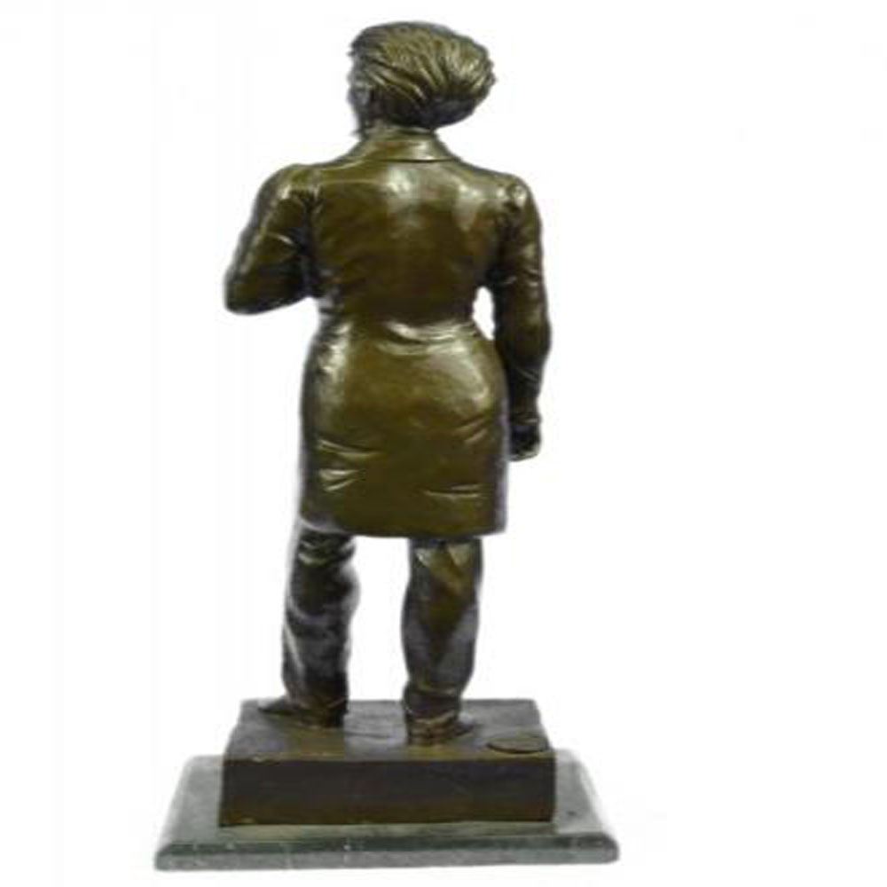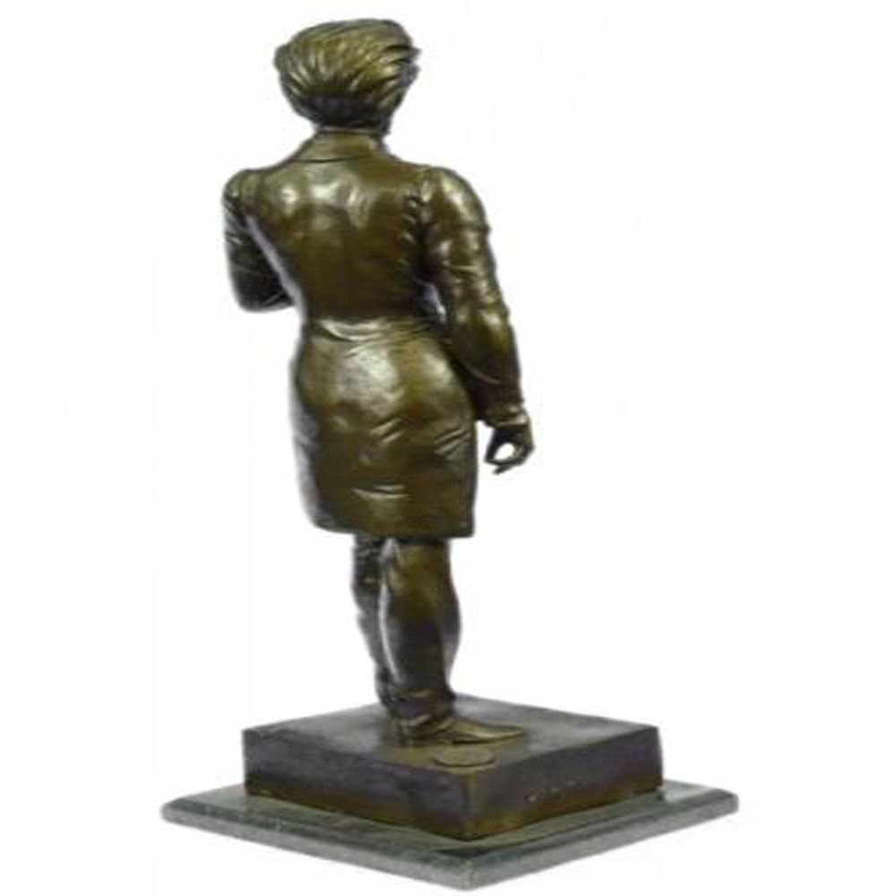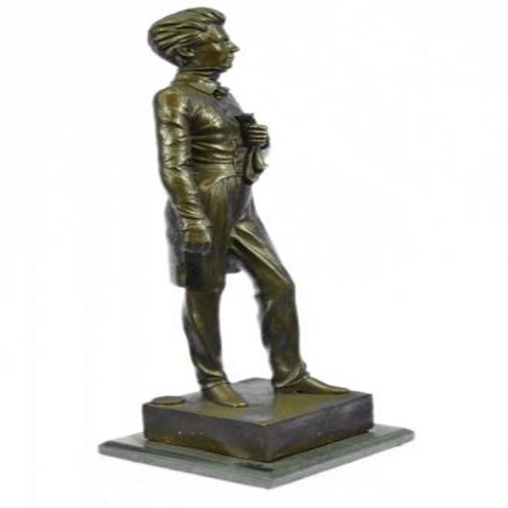 As he stands with an important piece of paper in his hand. His suit is very exquisite regular slacks with a button down blazer jacket that has that old fashion look to it, where it is long in the back and short in the front. He is wearing a bow tie and a turtle neck, and his hair is combed back. This Sculpture is a classy yet simple way to add a touch of charm to your home, office, or studio. This Sculpture was cast using the Lost Wax Method and has a light brown patina with touches of gold highlights and is mounted on a marble base. Bronze Dimensions with Marble Base: Height 17 X Width 6 inches. Weight: 11 LBS.
