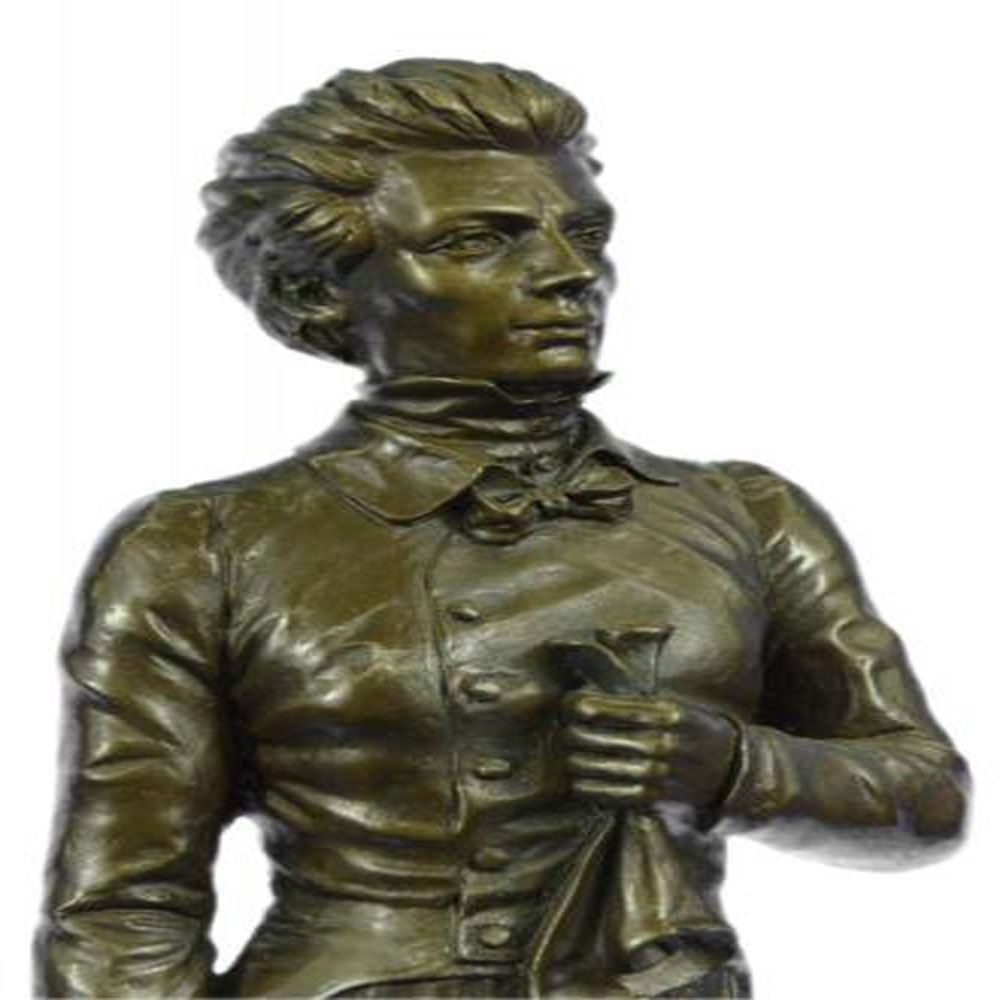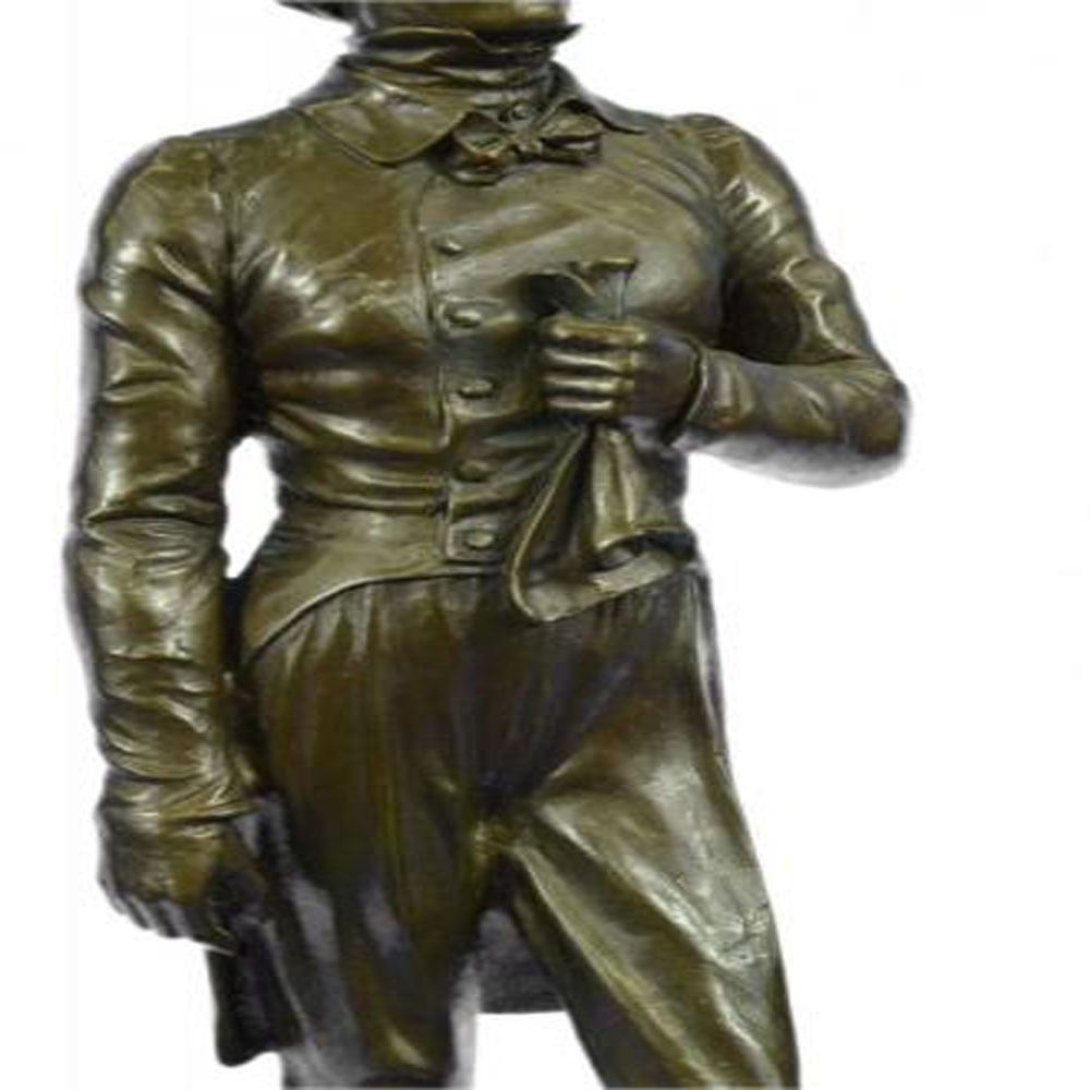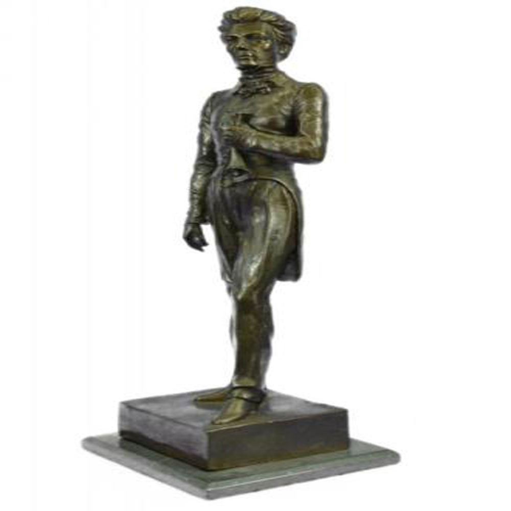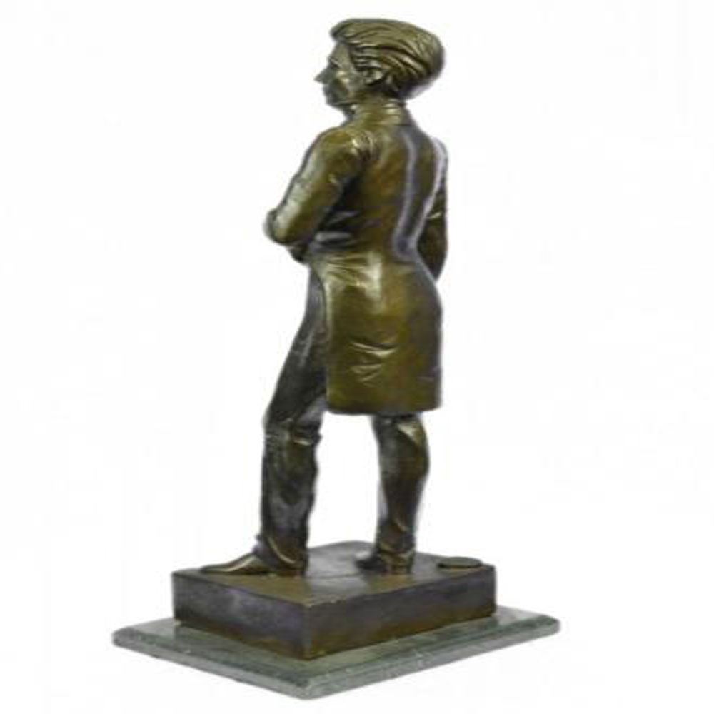 As he stands with an important piece of paper in his hand. His suit is very exquisite regular slacks with a button down blazer jacket that has that old fashion look to it, where it is long in the back and short in the front. He is wearing a bow tie and a turtle neck, and his hair is combed back. This Sculpture is a classy yet simple way to add a touch of charm to your home, office, or studio. This Sculpture was cast using the Lost Wax Method and has a light brown patina with touches of gold highlights and is mounted on a marble base. Bronze Dimensions with Marble Base: Height 17 X Width 6 inches. Weight: 11 LBS.