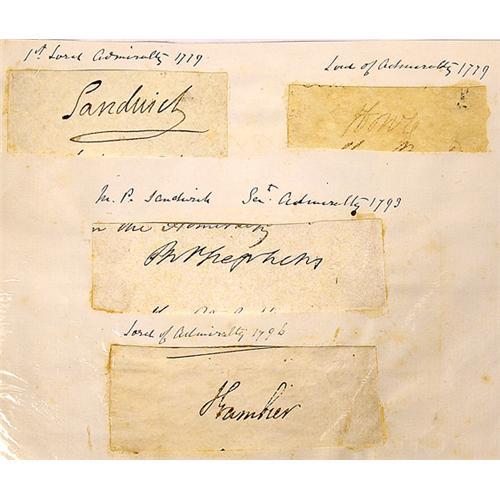 <Our item number 140066><B>British Admiralty Group: Sandwich, Howe, Stephens, and Gambier.</B> Four cut autographs mounted on a 5¾ x 7¼ in. sheet of paper, c. 1779; Lord Sandwich, First Lord of the Admiralty; Richard Admiral Earl Howe; Admiral Earl Stephens, the Admiralty secretary and Admiral James Gambier (1756-1833), important South Pacific explorer. Light toning. <BR>Estimated Value $300 - 500. <BR><BR>Our item number 140066<BR><IMAGES><P ALIGN="CENTER"><IMG SRC="http://www.goldbergcoins.net/liveauction/49jpegs/140066.jpg"> </P></IMAGES>