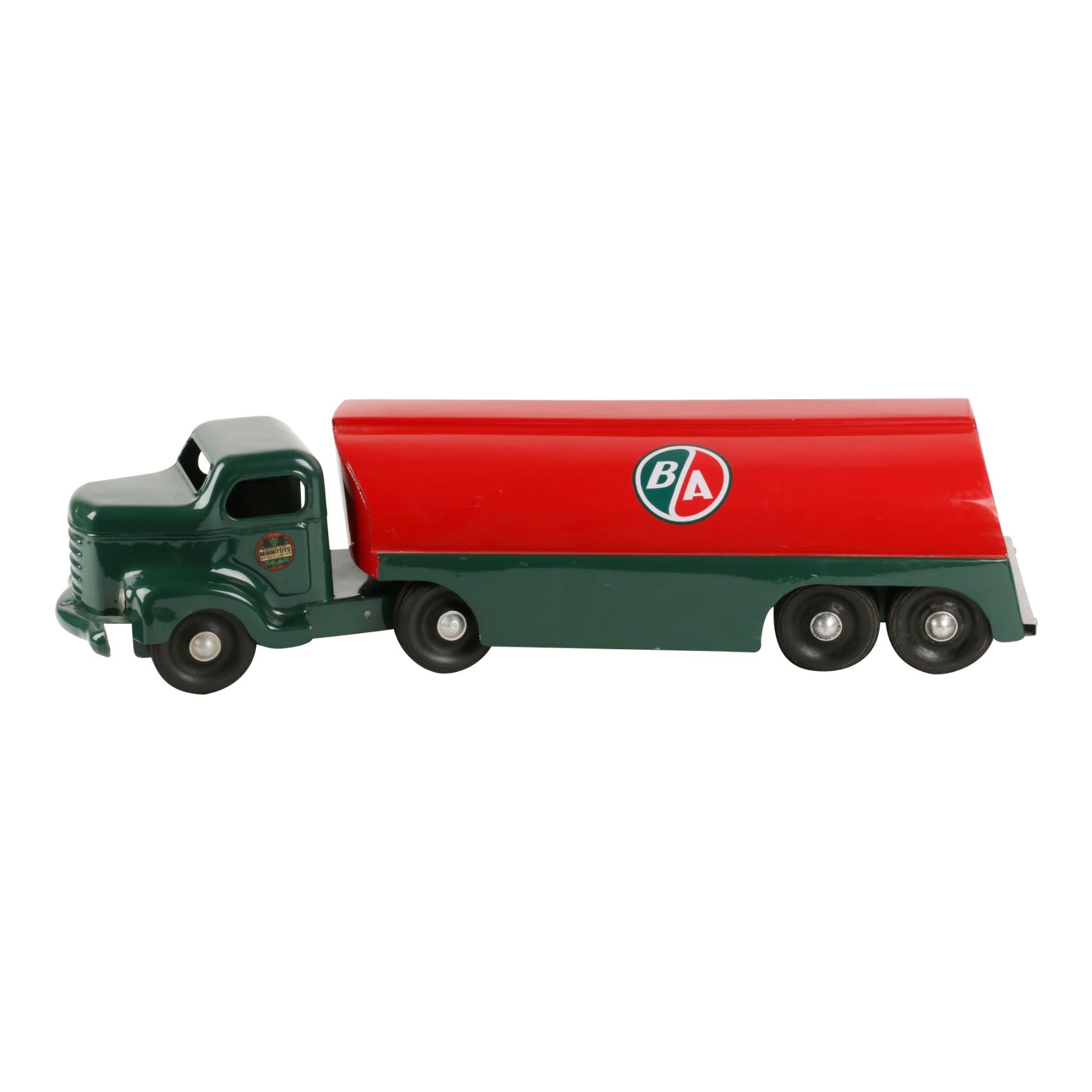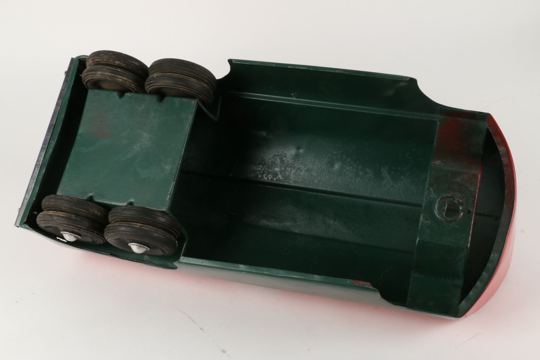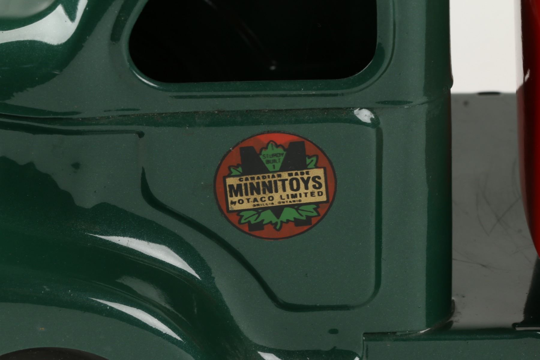 Circa 1950s. Marked, "Minnitoys Made by Otaco Limited, Orillia, Ontario". 27.5" x 8.5" x 7.5". Professionally restored. A few shallow impressions to the cab and trailer. $800-1000.