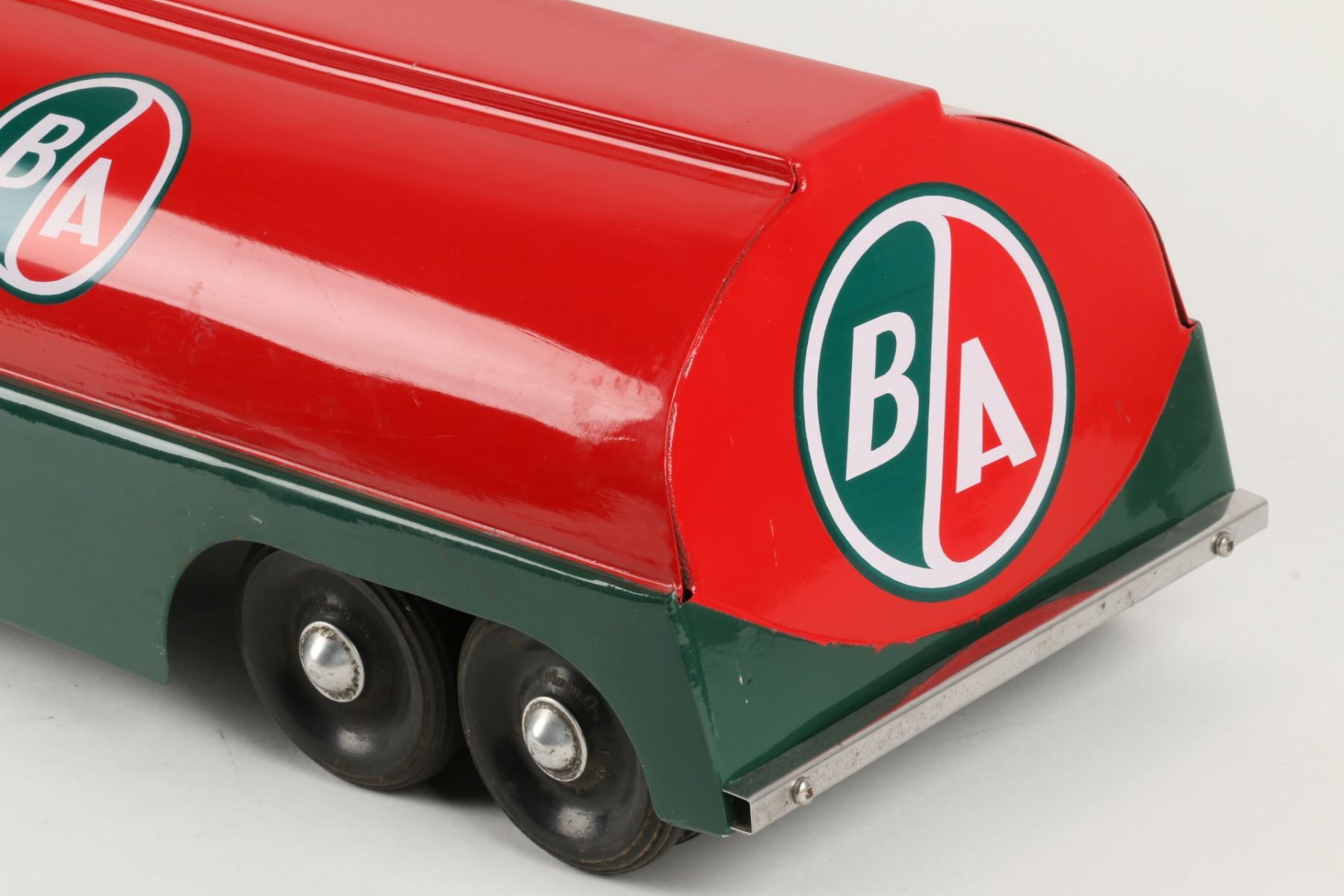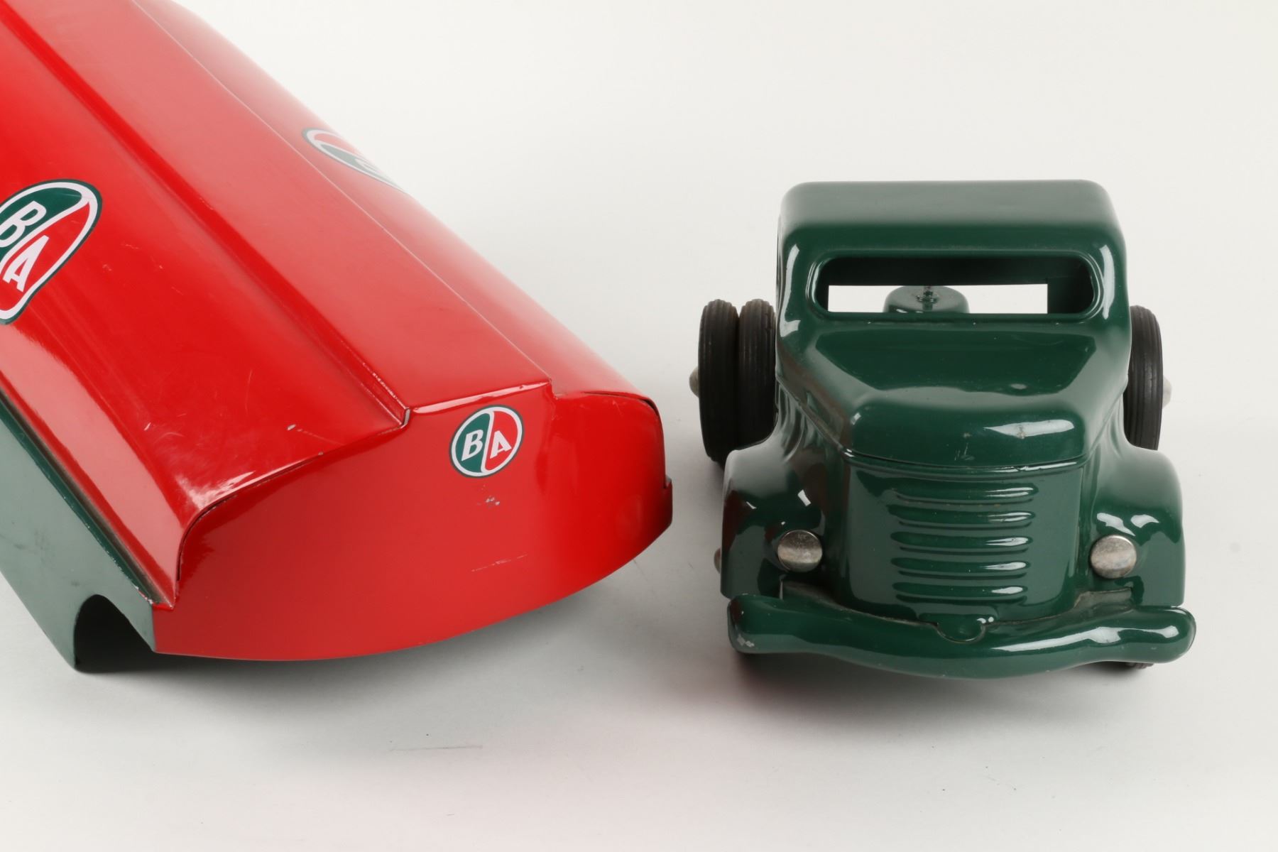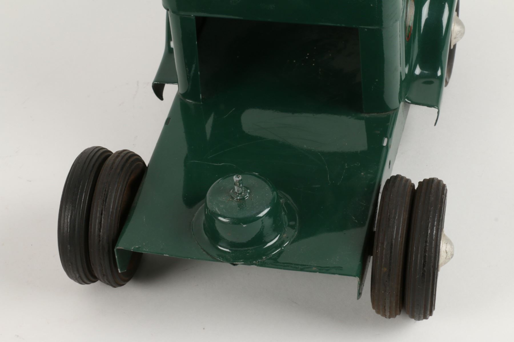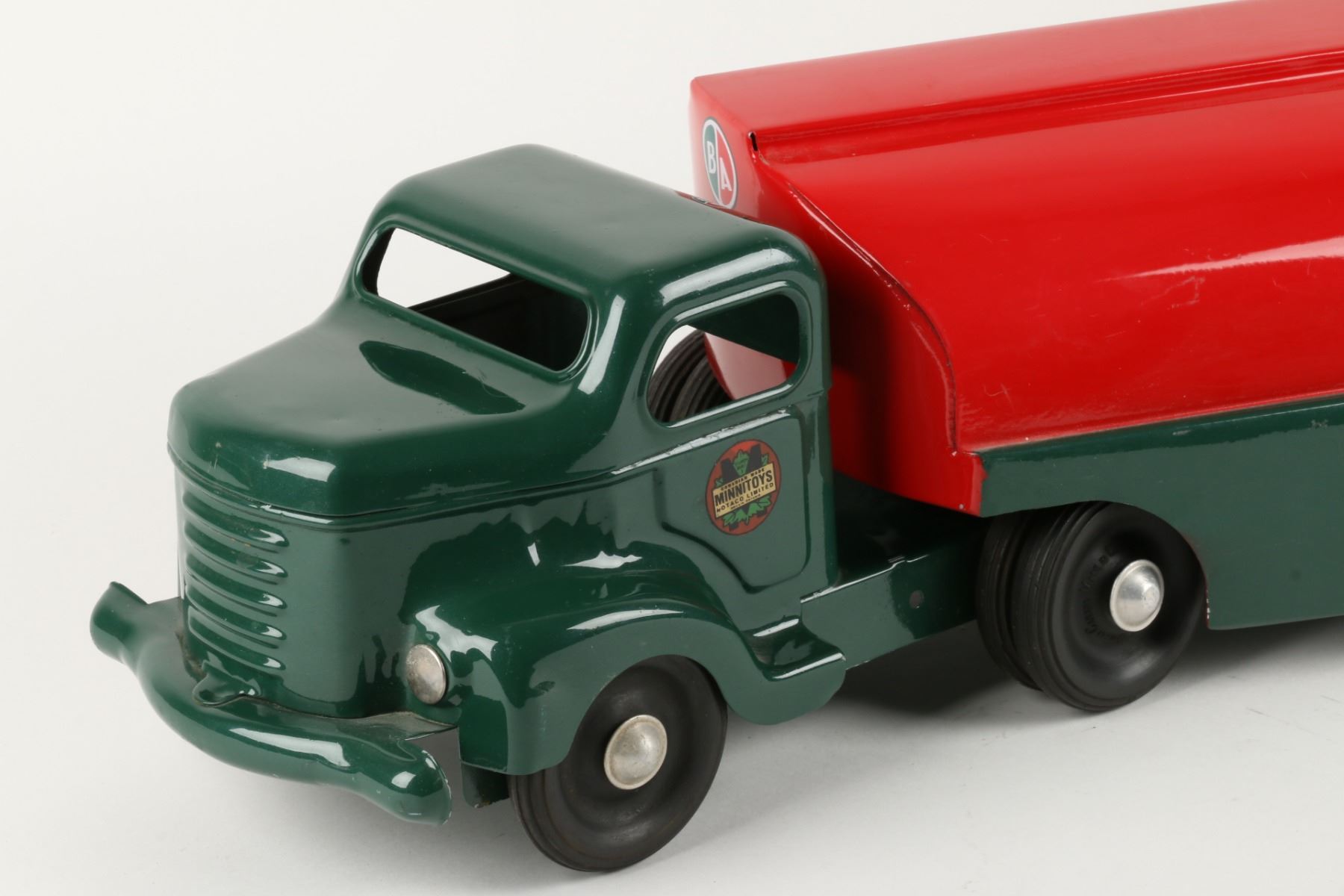 Circa 1950s. Marked, "Minnitoys Made by Otaco Limited, Orillia, Ontario". 27.5" x 8.5" x 7.5". Professionally restored. A few shallow impressions to the cab and trailer. $800-1000.