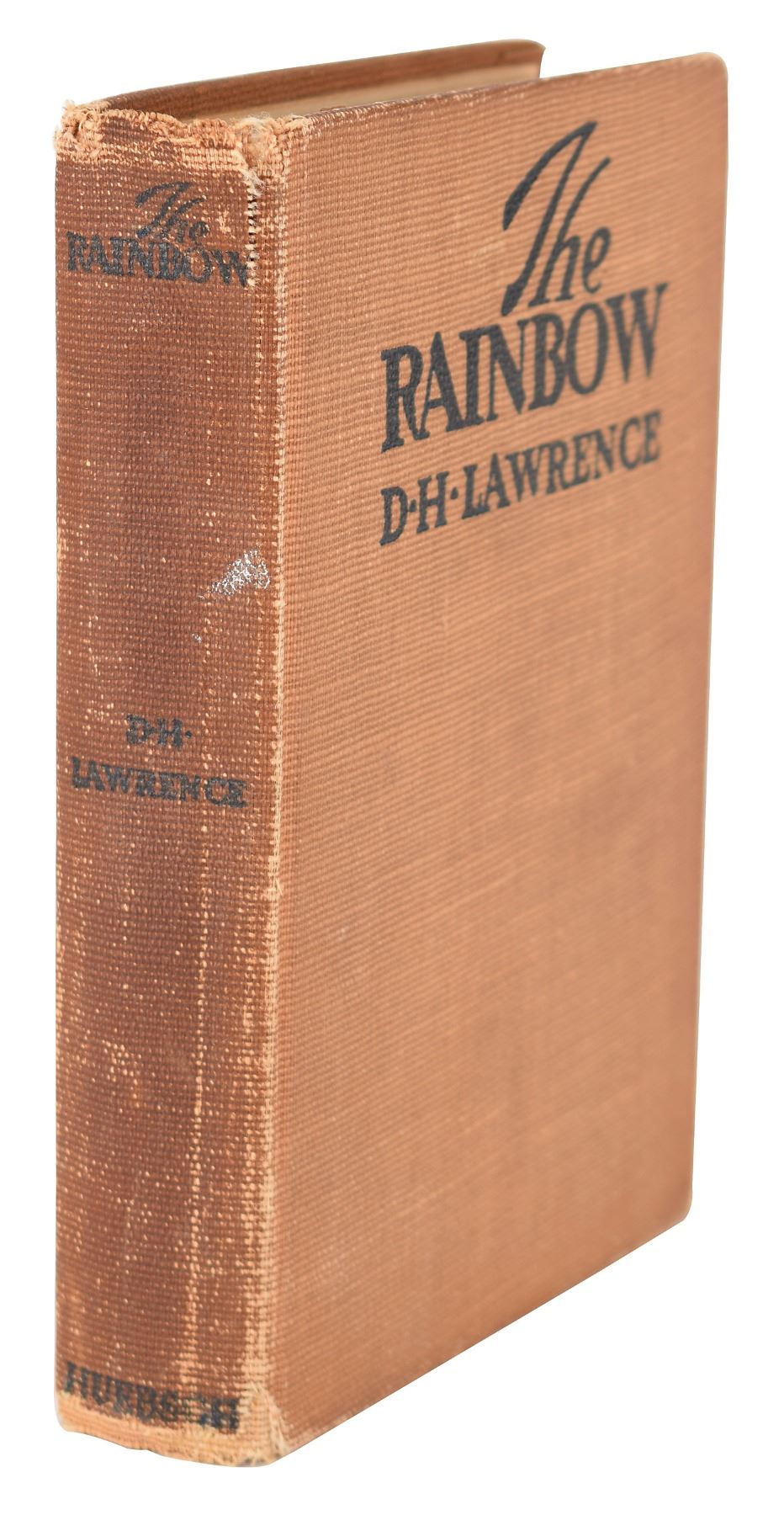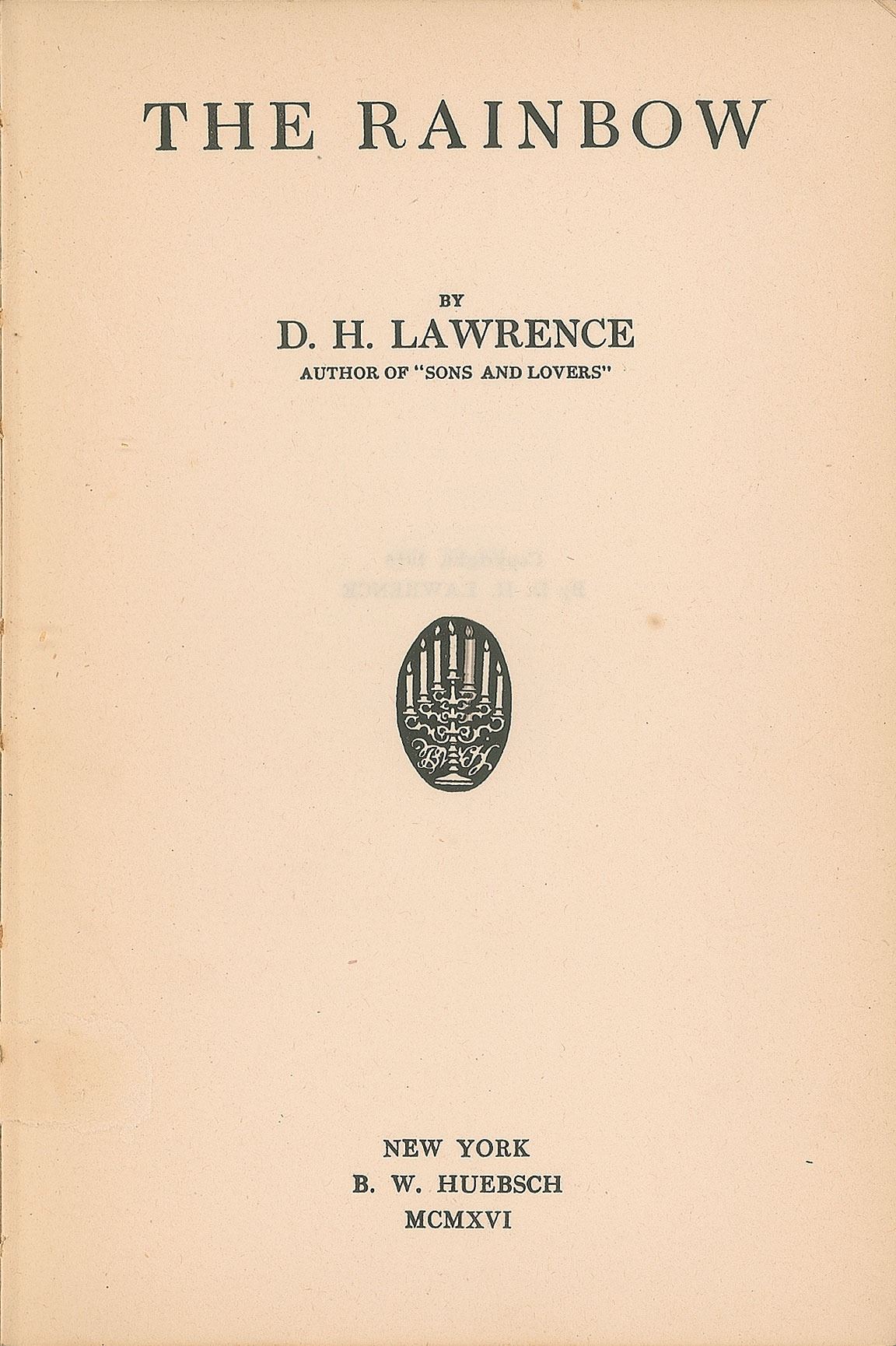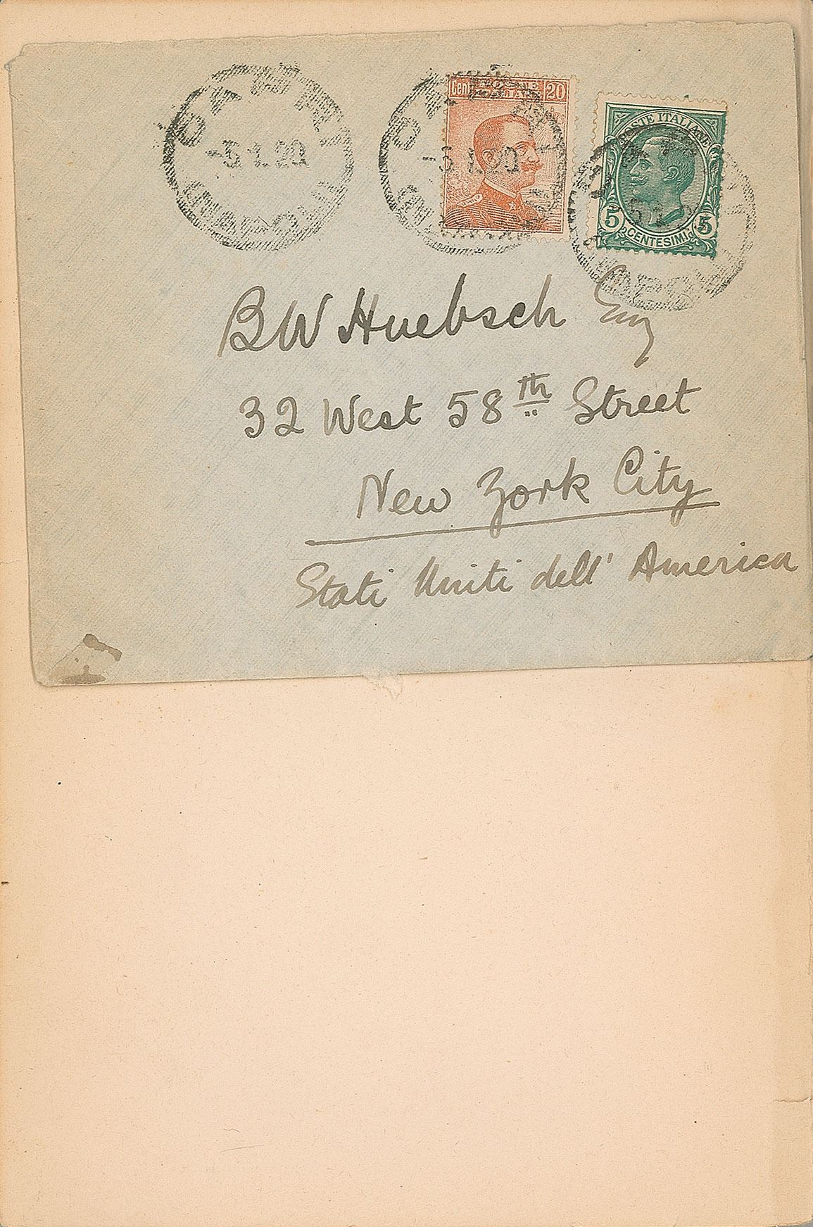 Hand-addressed mailing envelope by D. H. Lawrence, 4.5 x 3.75, to New York publisher B. W. Huebsch: "B. W. Huebsch, Esq., 32 West 58th Street, New York City, Stati Uniti dell' America." Postmarked at Capri on January 5, 1920. Affixed to the detached endpaper of a 1916 edition of The Rainbow, published by B. W. Huebsch. The envelope is in fine condition; the book is poor, with the textblock detached from the binding.