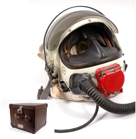 The helmet comes in a fitted brown fiberboard "snap lock" case with a label that reads: ""Taylor Pressure Helmet / Ref. 22C/2096 / Serial No. 698 / Date Fitted: 1/12/74 / Name Egerton, R. W. / Unit: "79th Tac. Fgt Squad". The case has a built in helmet stand to hold the helmet secure.