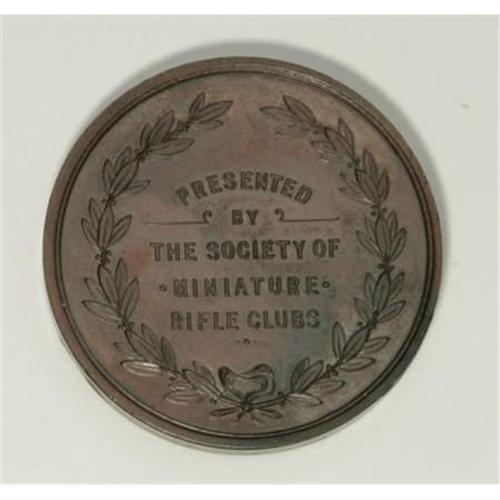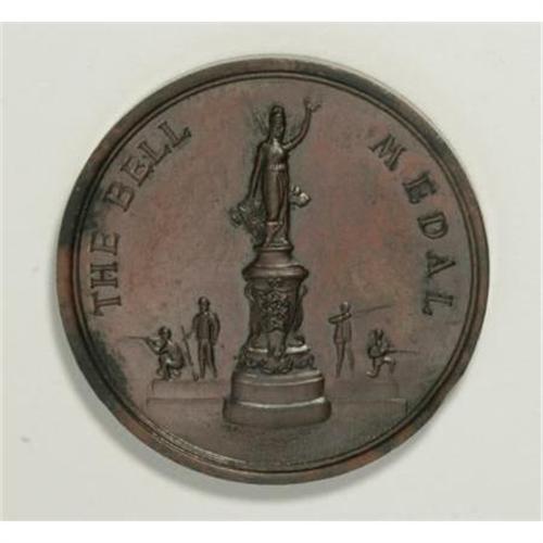 <B>British Bronze "The Bell Medal." </B></I> Bronze, 38.5 mm. Struck as a presentation medal and presented by The Society of Miniature Rifle Clubs. There is no engraver's name or maker on this piece, but in the center of the statue there are three lions, symbol of the British monarchy.<BR><BR><b>Shipping:</b> Coins & Currency (<a target="_blank" href="http://www.heritageauctions.com/common/shipping.php">view shipping information</a>)
