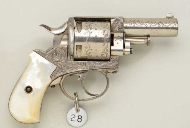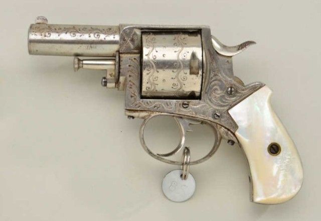 British Bull-Dog marked .44 D.A. revolver, nicely scroll engraved, pearl grips, NSNV. In near fine condition with 85%-95% original period nickle that is aging naturally. Good action, good bore, no visible proofs. Est.:$400-$800.
