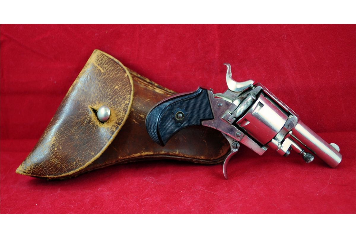 British Bulldog, 32 Cal.,6 Shot, 1880-1900, 2" Bbl., and Brown Leather Holster. Pistol is believed to be in good condition. See photos for more information. Gun is believed to be but not guaranteed to be in shooting order. Kennedys Auction Service has not attempted to test fire any gun in this auction and all guns are sold "IN AS IS CONDITION" and are not guaranteed to be operational.