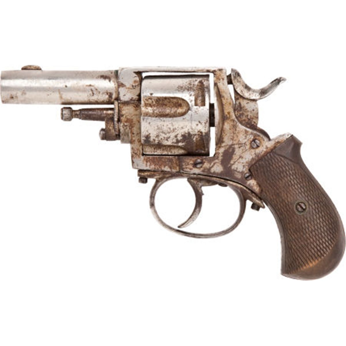 British Bulldog Double Action Revolver. No visible serial number. Approximately .44 caliber, 2 5/8-inch barrel. Top strap marked, "BRITISH/BULLDOG." Nickel-plated finish. 5-shot cylinder. Belgian proof marks on frame and cylinder. Checkered hardwood grips. Condition: Fair to good. Retaining approximately 30-40% original finish, the balance fading to a brown patina with scattered patches of light rust throughout. Action good, cylinder rotates crisply but cannot be removed easily. Cylinder pin/ejector functional.NRA FIREARMS FOR FREEDOM PROGRAM