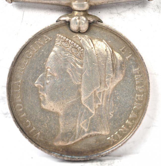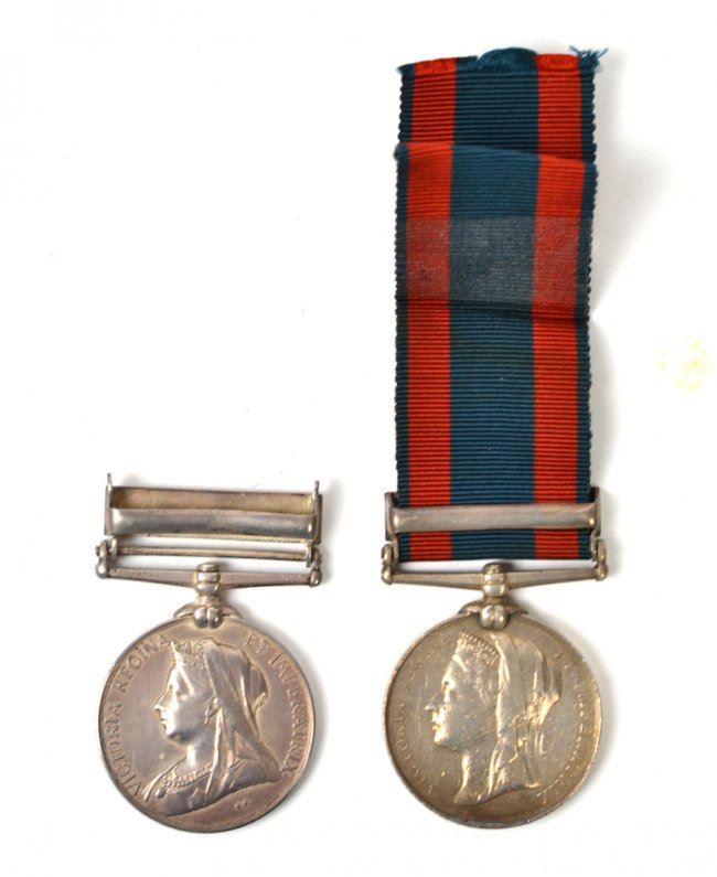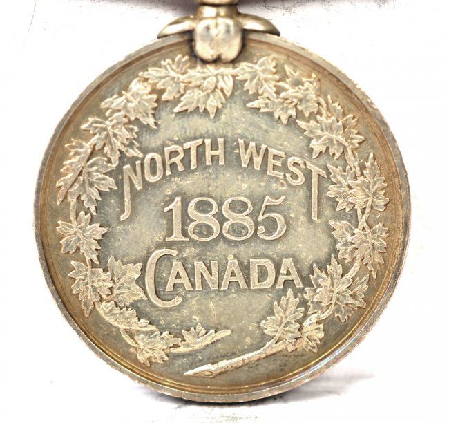 Pair of Queen Victoria silver campaign medals for use in Canada. The first, 1866 Fenian Raid bar with suspender but no ribbon, named on edge, Fine condition. The second, 1885 Northwest Canada with Saskatchewan bar, suspender and ribbon, Fine condition but surfaces marked.