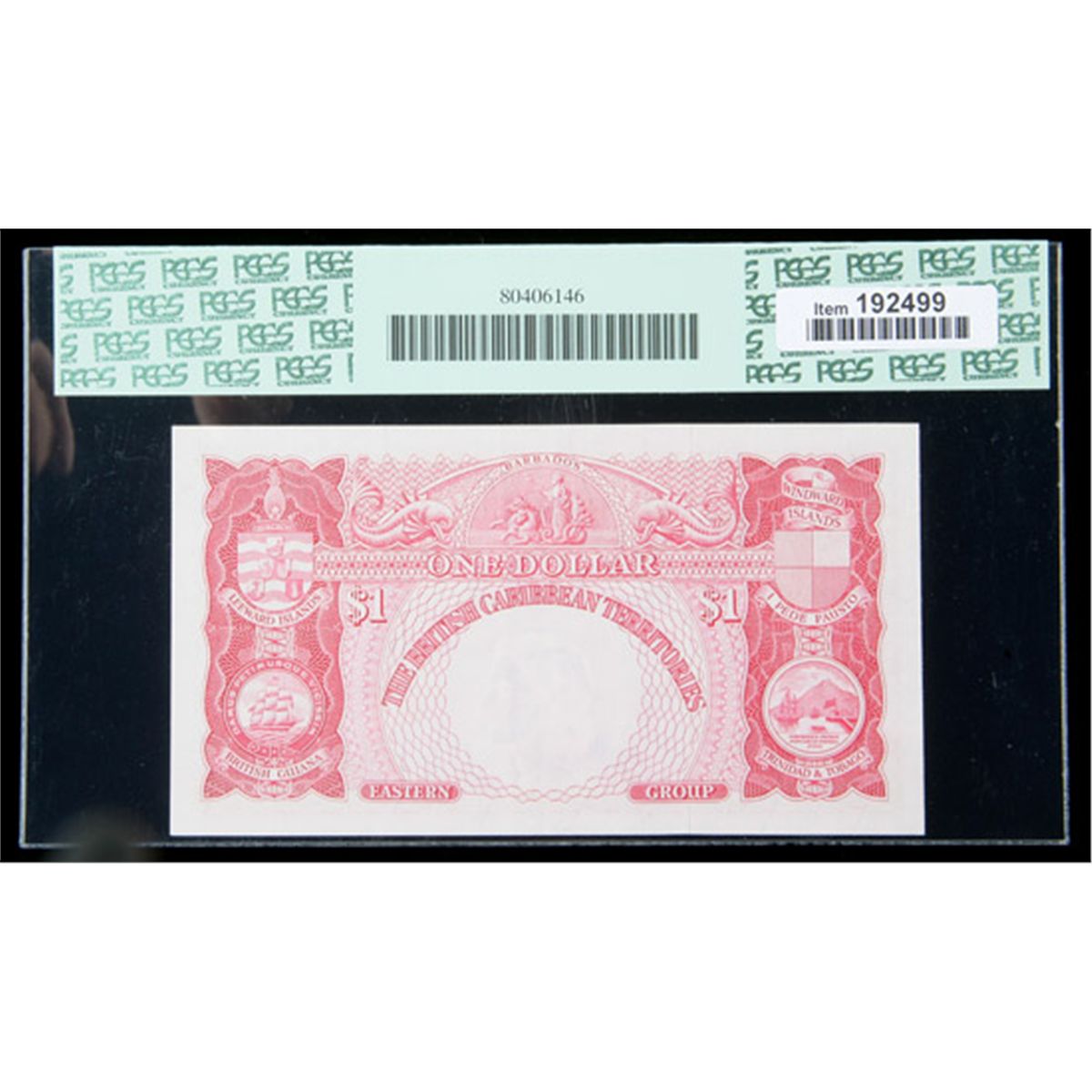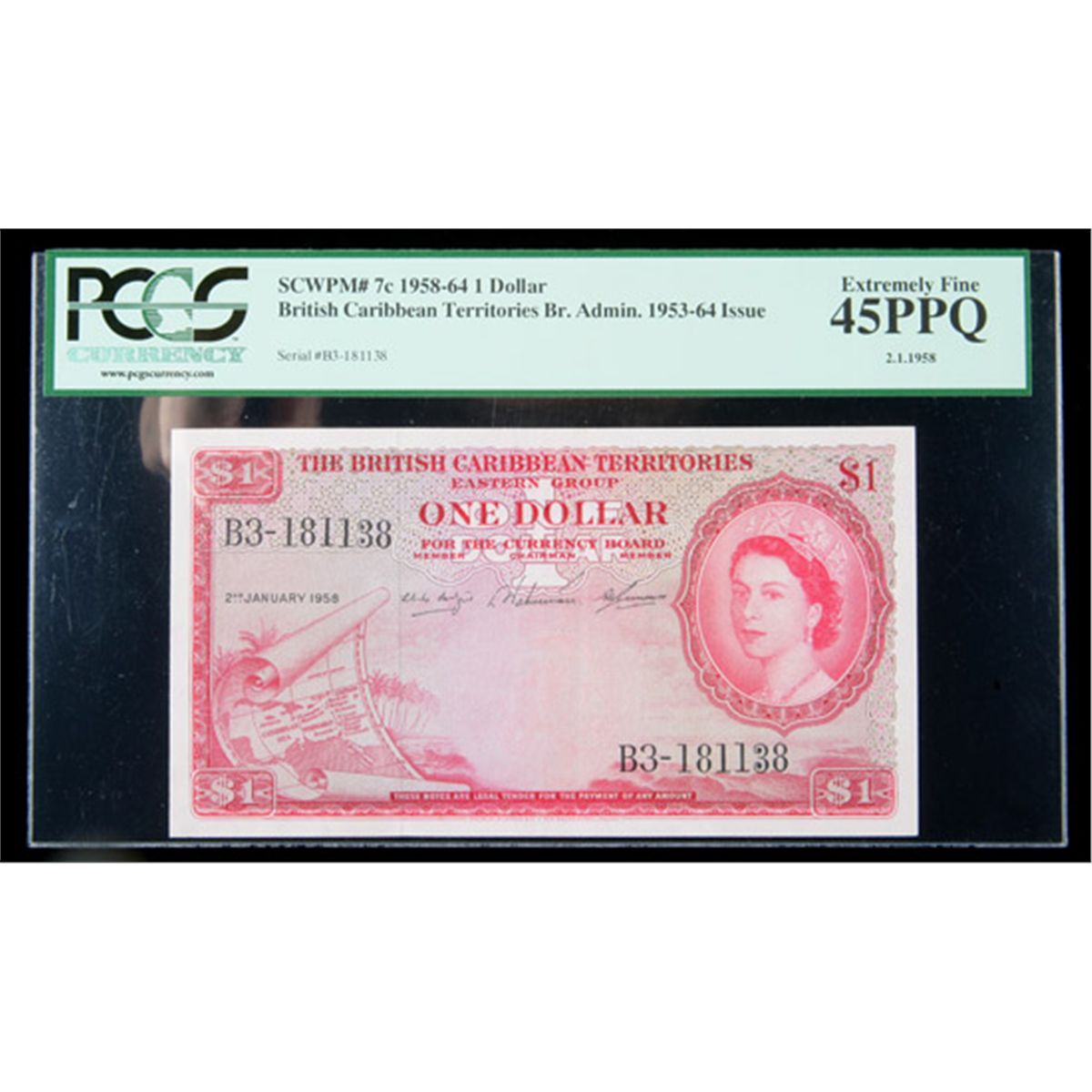British Caribbean Territories SCWPM# 7c, 2.1.1958 1 Dollar. PCGS Extremely Fine 45PPQ. . Fr-7c. This bright and crisp example is flawless save for a few light folds.
