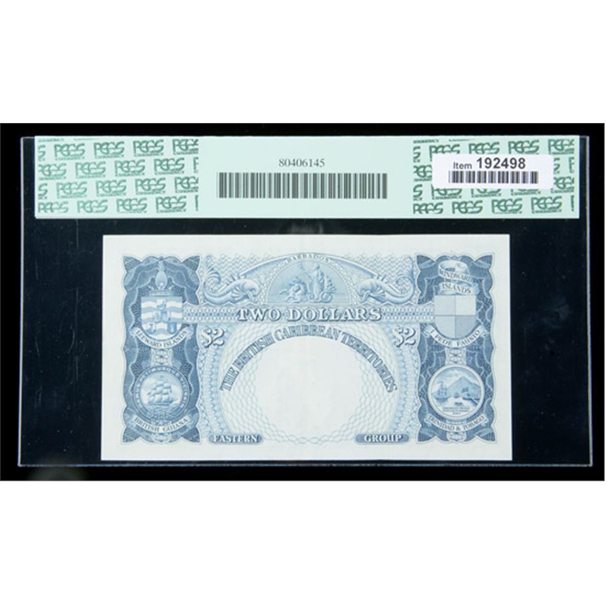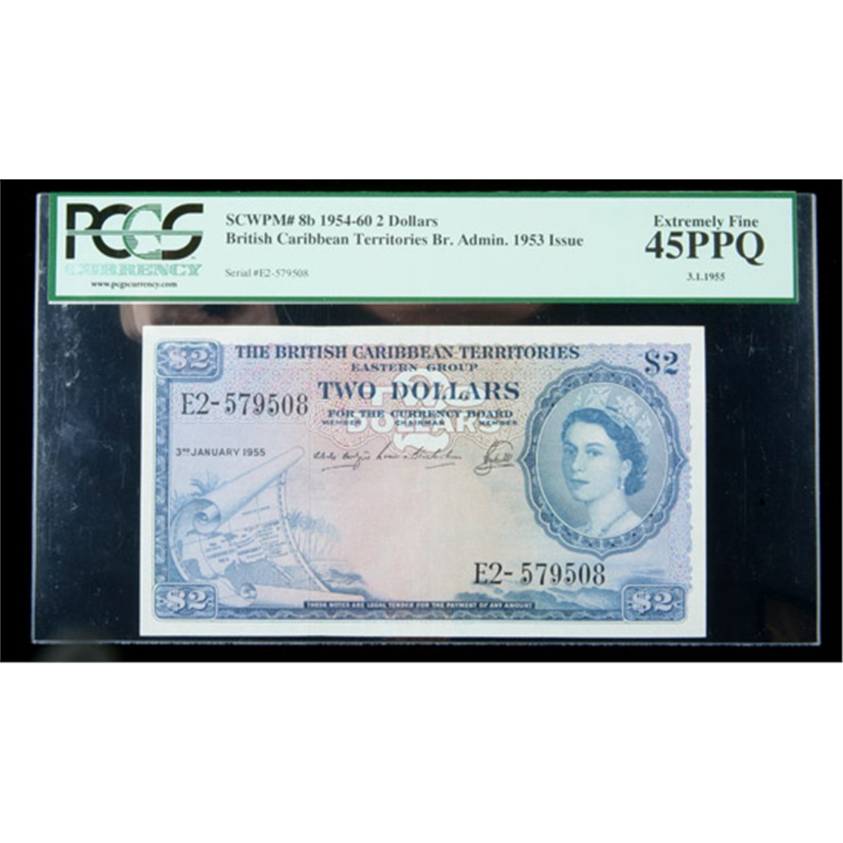 British Caribbean Territories SCWPM# 8b, 3.1.1955 2 Dollars. PCGS Extremely Fine 45PPQ. . Fr-P-8b. Just a few light folds are present on this lovely $2 example. Scarce any finer.