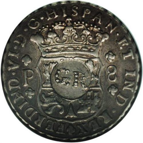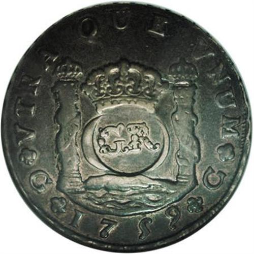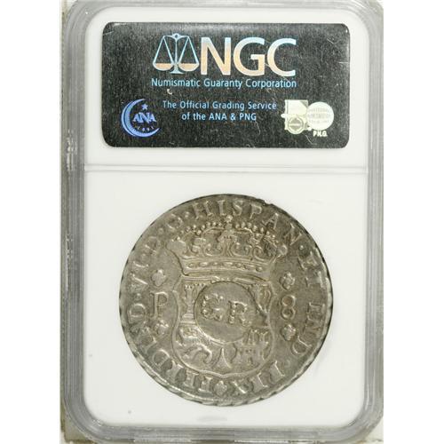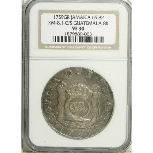 <B>British Colonial 6 Shillings 8 Pence (circa 1758), </B></I>KM8.1, VF30 NGC, an exceptionally attractive example with light silvery-gray patina and considerable sheen to the surfaces. The host coin for this GR countermark is a Guatemala 1759 Pillar 8 Reales which is far rarer than the Mexico or Peru issues.<BR><BR><b>Shipping:</b> Coin/Currency (<a target="_blank" href="http://www.heritageauctions.com/common/shipping.php">view shipping information</a>)