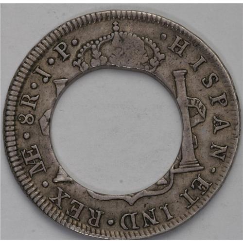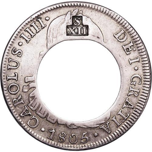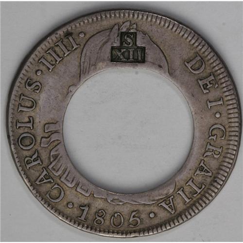 <B>British Colonial XII Bits (1811), </B></I>KM12, cut and counterstamped issue with S over XII stamped on a center cut Lima 8 Reales 1805. Extremely rare type with only 6-8 genuine examples known. Choice VF host coin and countermark. Ex-Gibbs and David Spink.