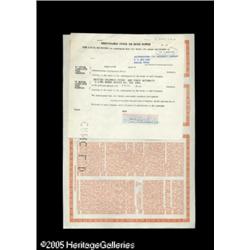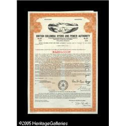 <B>British Columbia Hydro and Power Authority</B></I><BR><B>$1,000,000 9 5/8% Bond due June 1, 2005. Dated June 1, 1975. New,</B></I> with a stock power stapled to the back and cancellation marks at right center. Printed in orange and black with a hydroelectric dam vignette at center. Lot:15542