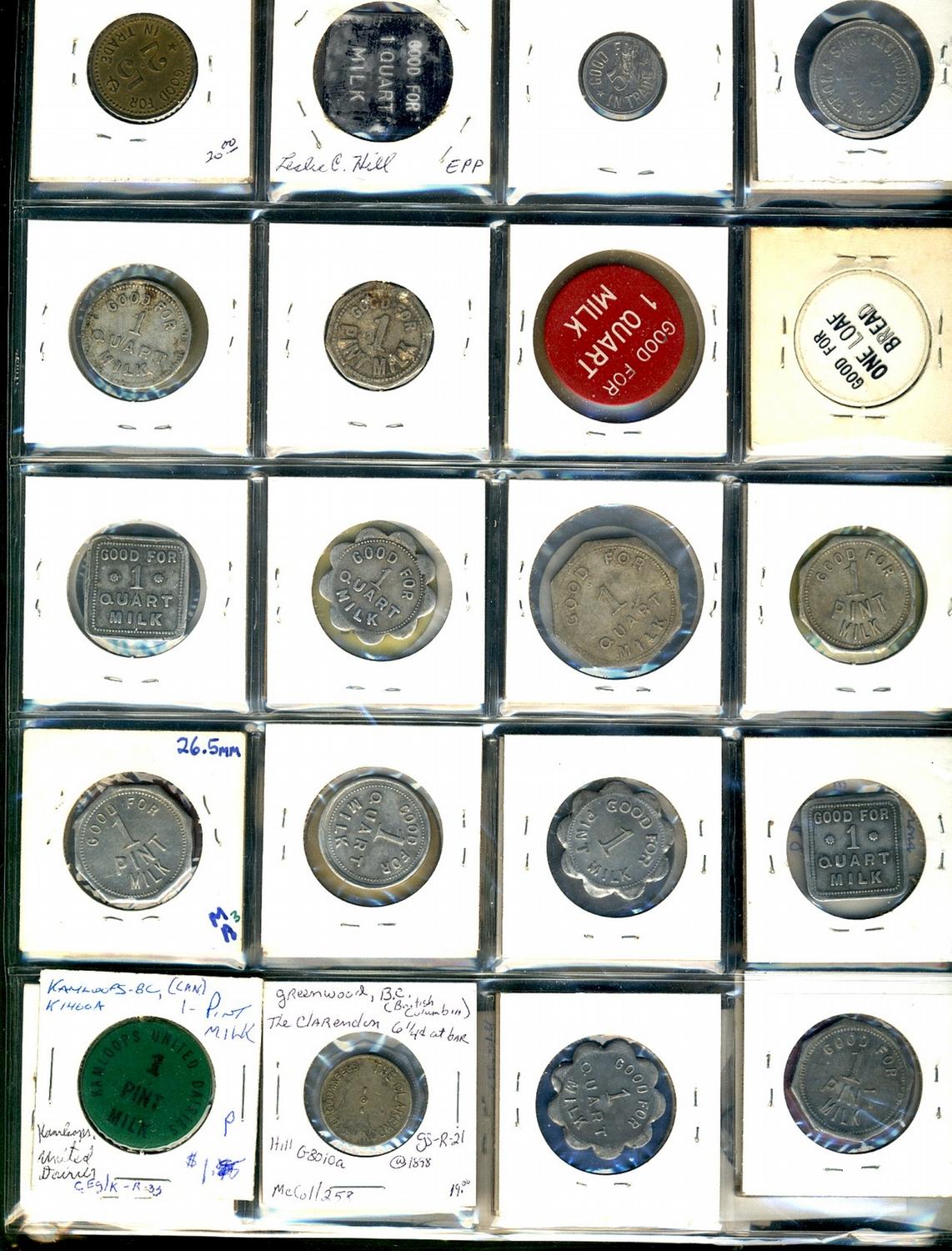 British Columbia. Various dairy and merchant tokens from the following locals: Alberni, Armstrong, Chase, Chilliwack, Cranbrook, Delta, Edgewater, esquimalt, fernie, Genoa Bay, Grand Folks, Greenwood, Haney, Kelowna. (44 pieces)