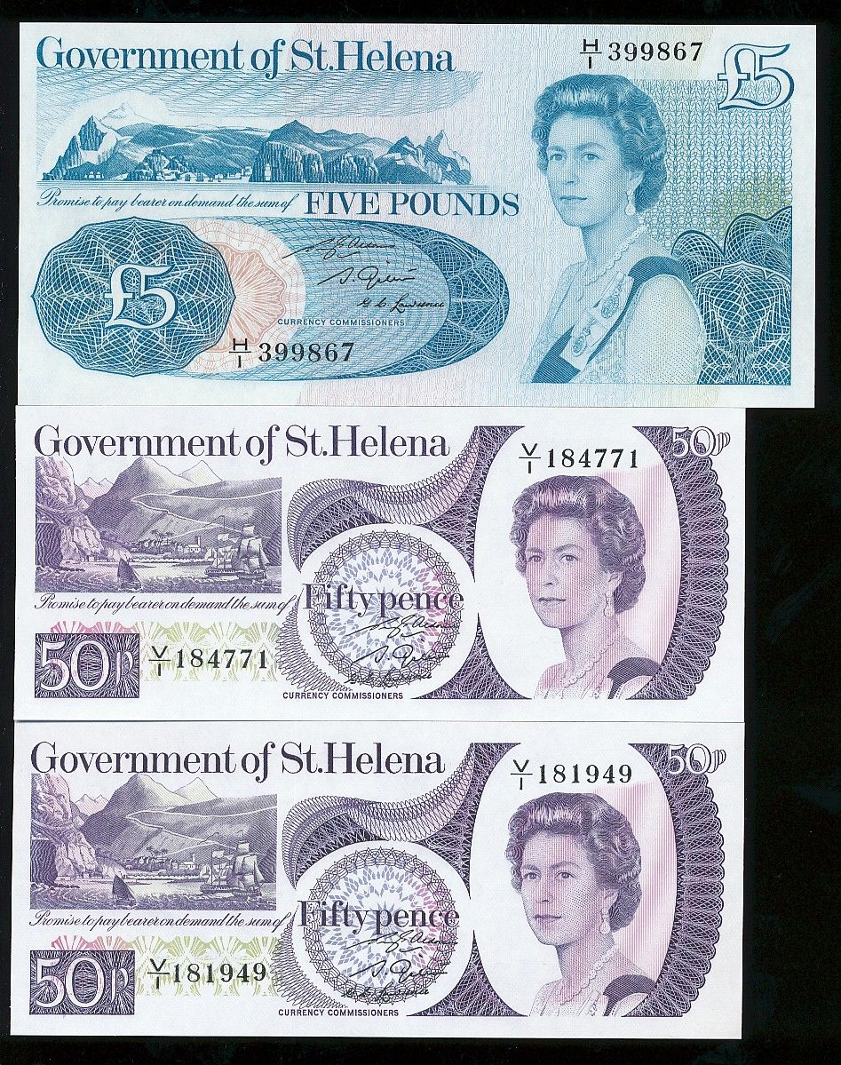 British Commonwealth Banknote Lot; includes Gov't of St Helena 1979 50p(2) & 1981 £5. Lot of 3 notes all UNC.