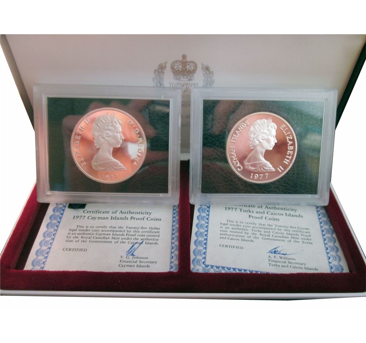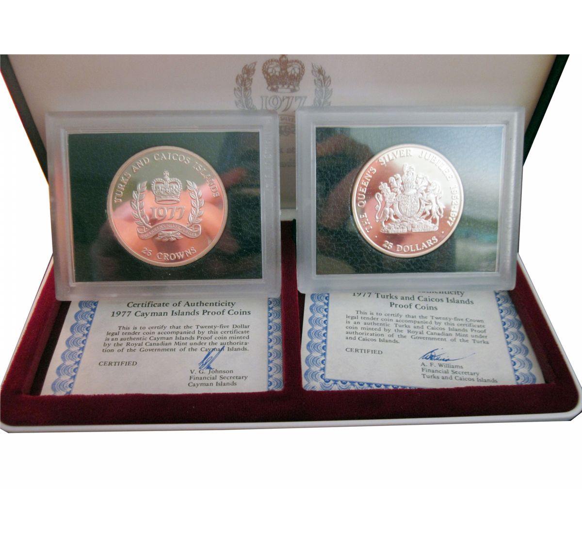 British Commonwealth Set 1977; Issue by British Mint, set of 2 Silver Proof Crown. 25 Crowns Turks and Caicos Islands & 25 Dollars Cayman Islands. 2,8083 oz ASW of Silver.