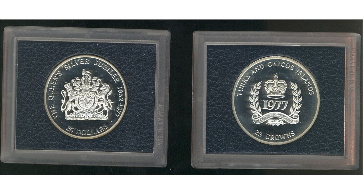 British Commonwealth Set 1977; Issue by British Mint, set of 2 Silver Proof Crown. 25 Crowns Turks and Caicos Islands & 25 Dollars Cayman Islands. 2,8083 oz ASW of Silver.