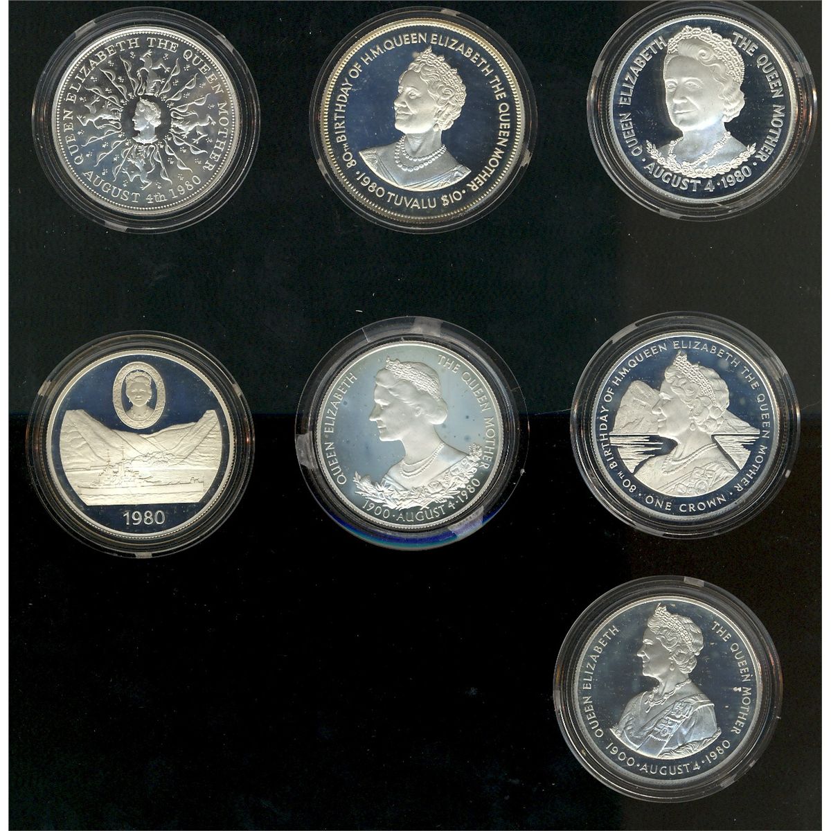 British Commonwealth Set 1980; Issue by British Mint, set of 7 Silver Proof Crown. 1 Crown Gibraltar, 1 Crown GB, 25 Pence Guernsey, 25 Pence Tristan Da Cunha, 10 dollars Tuvalu, 25 Pence St. Helena, 25 Pence Falklan Island. 5,8877 oz ASW of Silver.