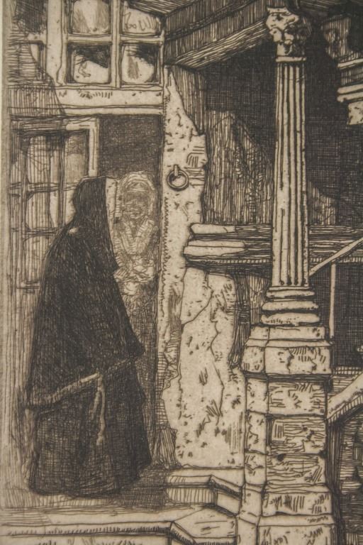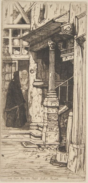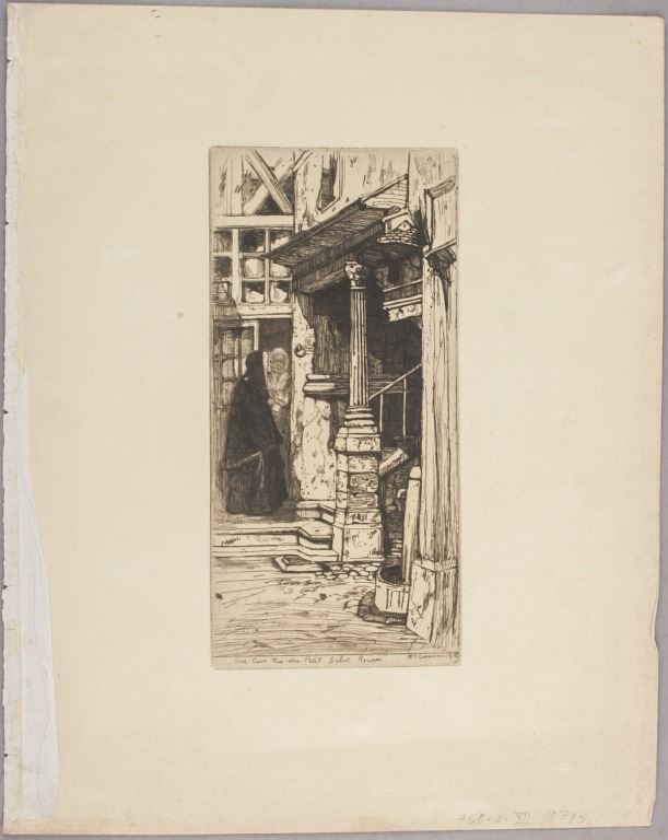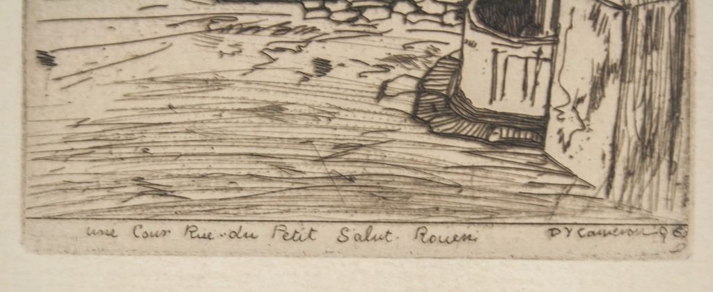 Etching on paper. Featuring small street with two figures speaking at the end. Signed DY Cameron in block. "7SB . 2 . XII . 8715" inscribed to the bottom. Plate size: 17.5 x 8.5 cm (7 x 3.3 inches). Mat size: 35.5 x 25.5 cm (14 x 10 inches).