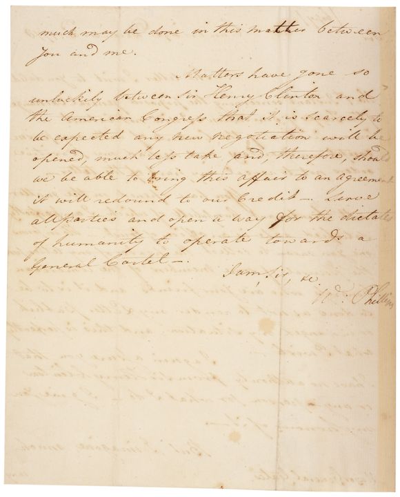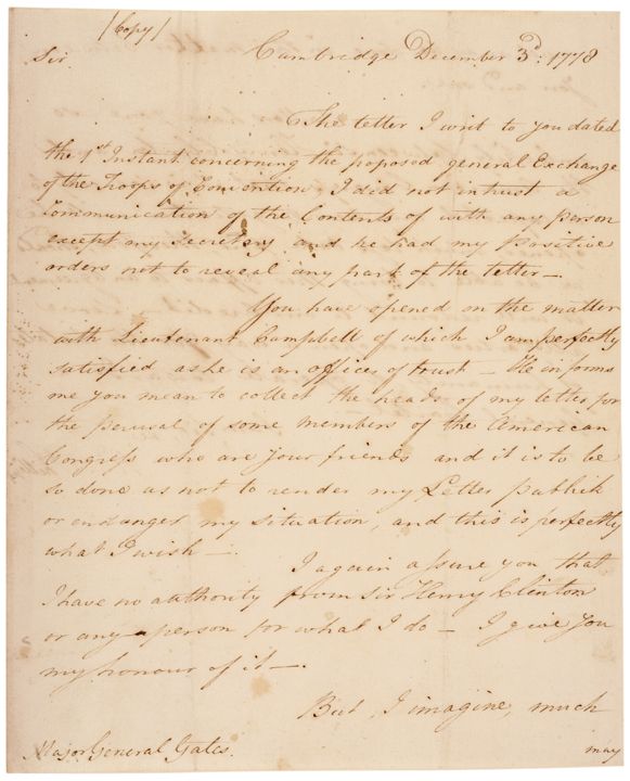 It reads, in part: “The letter I wrote to you dated the 1st Instant concerning the proposed general exchange of the Troops of Convention [British prisoners captured at Saratoga] I did not entrust a Communication of the Contents of with any person accept my secretary and he had my positive orders not to reveal any part of the letter. You have opened on the matter with Lieutenant Campbell [Charles Campbell, d. 1780, a lieutenant with Fraser’s Highlanders captured at Saratoga] of which I am perfectly satisfied as he is an officer of trust - He informs me you mean to collect...my letters for the perusal of some members of the American Congress who are your friends... I again assure you I have no authority from Sir Henry Clinton or any person for what I do... Matters have gone so unluckily between Sir Henry Clinton and the American Congress that it is scarcely to be expected any new negotiation will be opened, much less take place and therefore, should we be able to bring this affair to an agreement it will redound to our Credit - Serve all parties and open a way for the dictates of humanity to operate towards a General Cartel.”