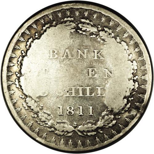 <B>Counterstamped British George III 1811 Three Shillings Bank Token.</B></I> Counterstamped Bradford Workhouse. Listed on page 317 of Dr. Brunk's <I>American and Canadian Countermarked Coins.</B></I> This is the plate piece pictured in the reference. The catalog number is 50560; the host coin is listed in the Krause catalog as KM-Tn4.<BR><I>Ex:Jess Peters Auction (1/22/74), lot number 222, original card included.</B></I>