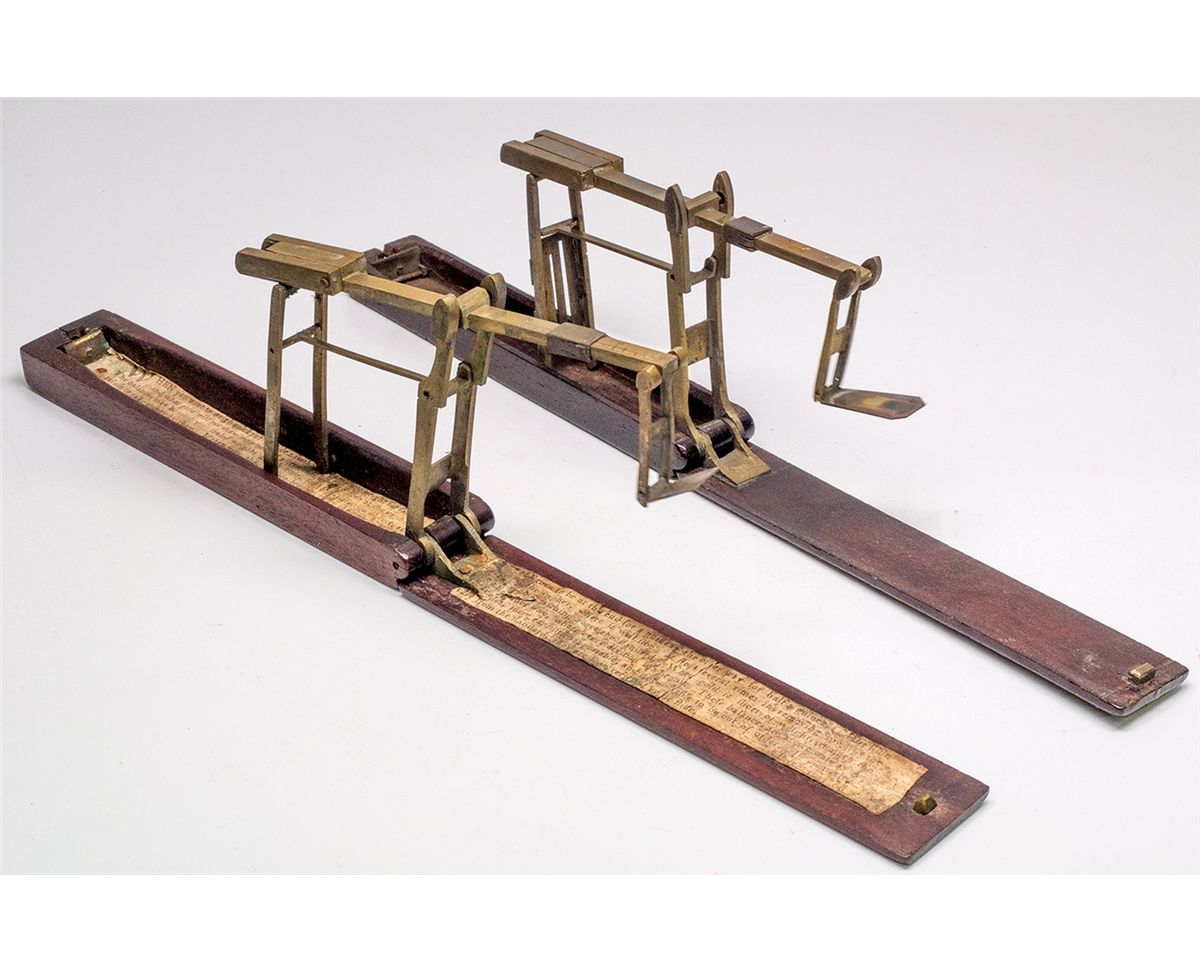 c1717 Lot of 2. 1) Choice of early British gold coin counterfeit detector dating to 1717 to 1813. This piece is an intricate balance used for gold guinea and half guinea. This piece is an intricate early scientific instrument. The printed instructions are adhered to the inside wood panels written in old English. From the J.J. Ford Collection. 2) A very similar scale, possibly from a later period than the first (c1790-1813), with the arm marked differently with fewer graduations. No paper instructions. Fine condition. The British guinea was a gold coin made of gold from Guinea in Africa (now Ghana). - HKA#66218