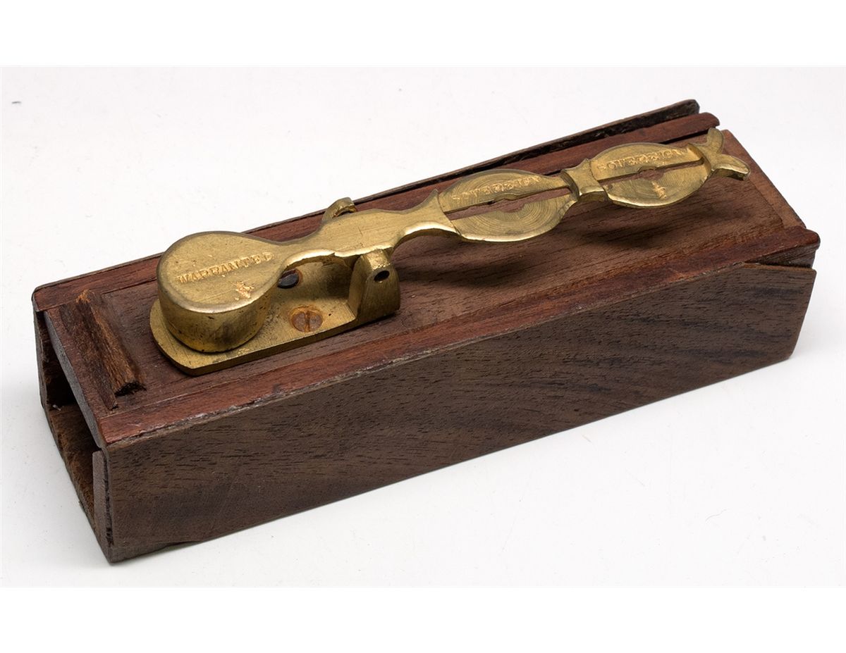 c1850 This piece comes with its own delightful little wood box and sliding panel. Printed instructions for the piece can be seen on the sliding wood panel. The box measures 5” x 1.5” and has some wear. There is no maker’s mark visible on the piece. From the J.J. Ford Collection. - HKA#66189