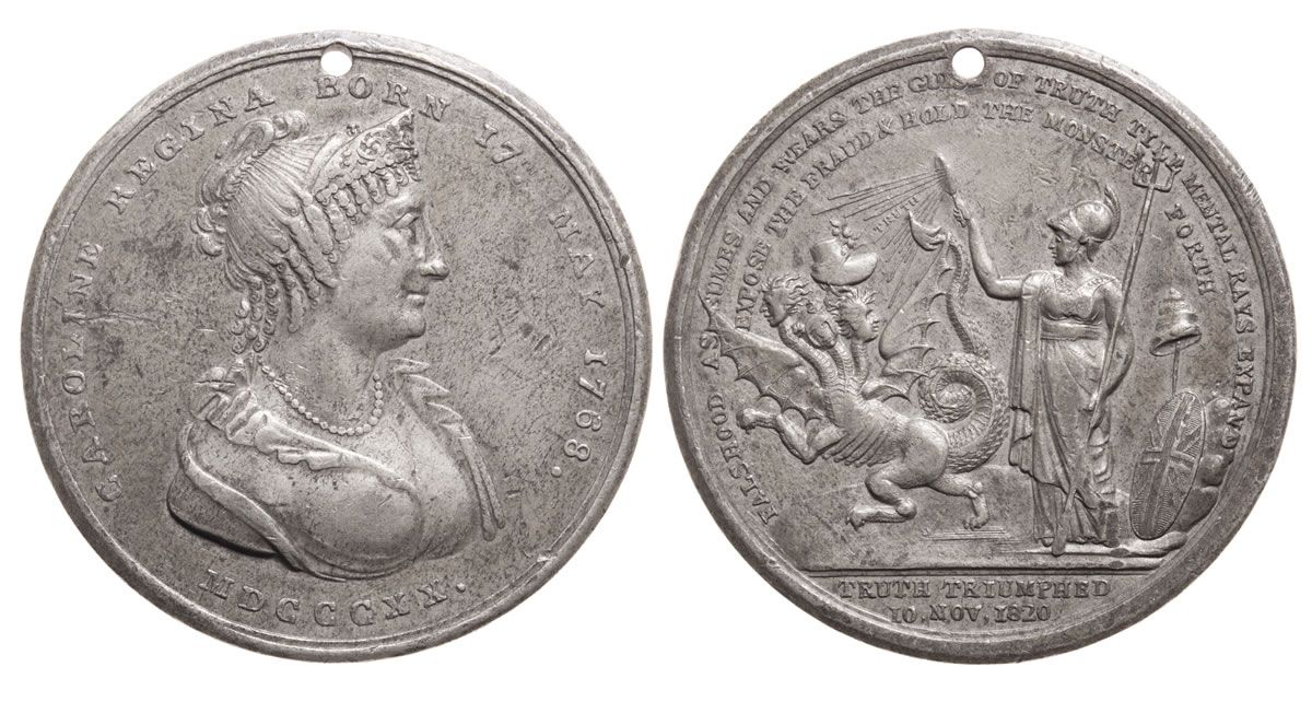 Queen Caroline restored, 1820, Obv: "Caroline Regina Born 17th May, 1768", "MDCCCXX" below bust, facing right; Rev: "Falsehood Assumes And Wears The Guise of Truth Till Mental Rays Expand/Expose The Fraud & Hold The Monsters Forth", "Truth Triumphed/10 No