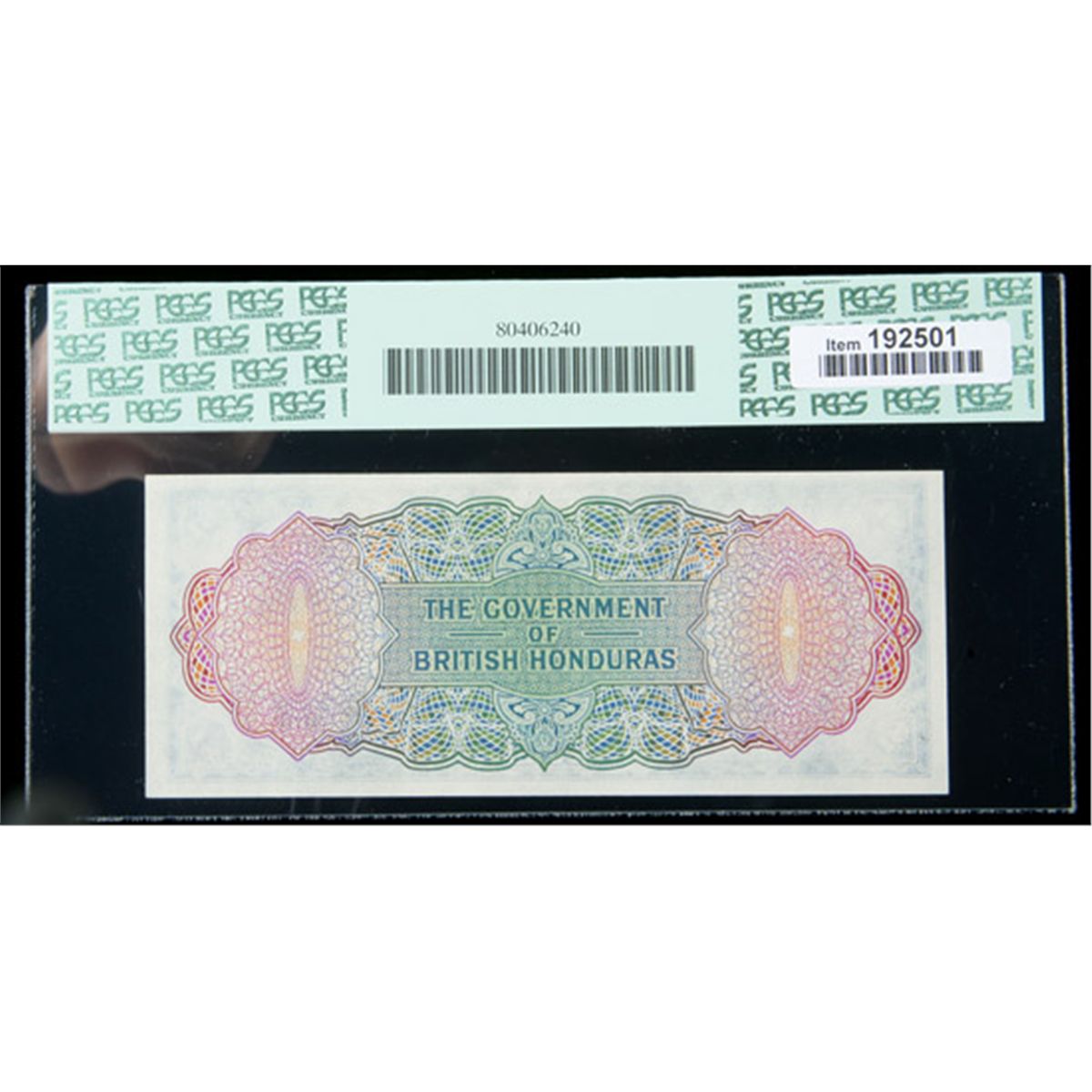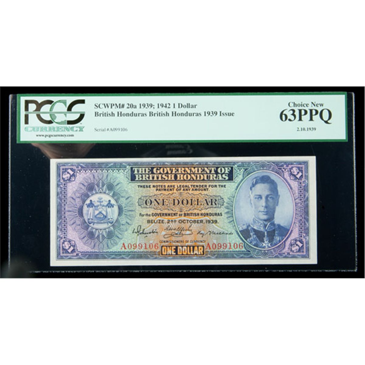 British Honduras SCWPM# 20a, 2.10.1939 1 Dollar. PCGS Choice New 63PPQ. . Fr-P-20a. This lovely example is very scarce in uncirculated grades, and few have survived for collectors today. It is priced at $1250 in "UNC" in the Krause reference, and we wouldn't be surprised if this choice note brought that realization.
