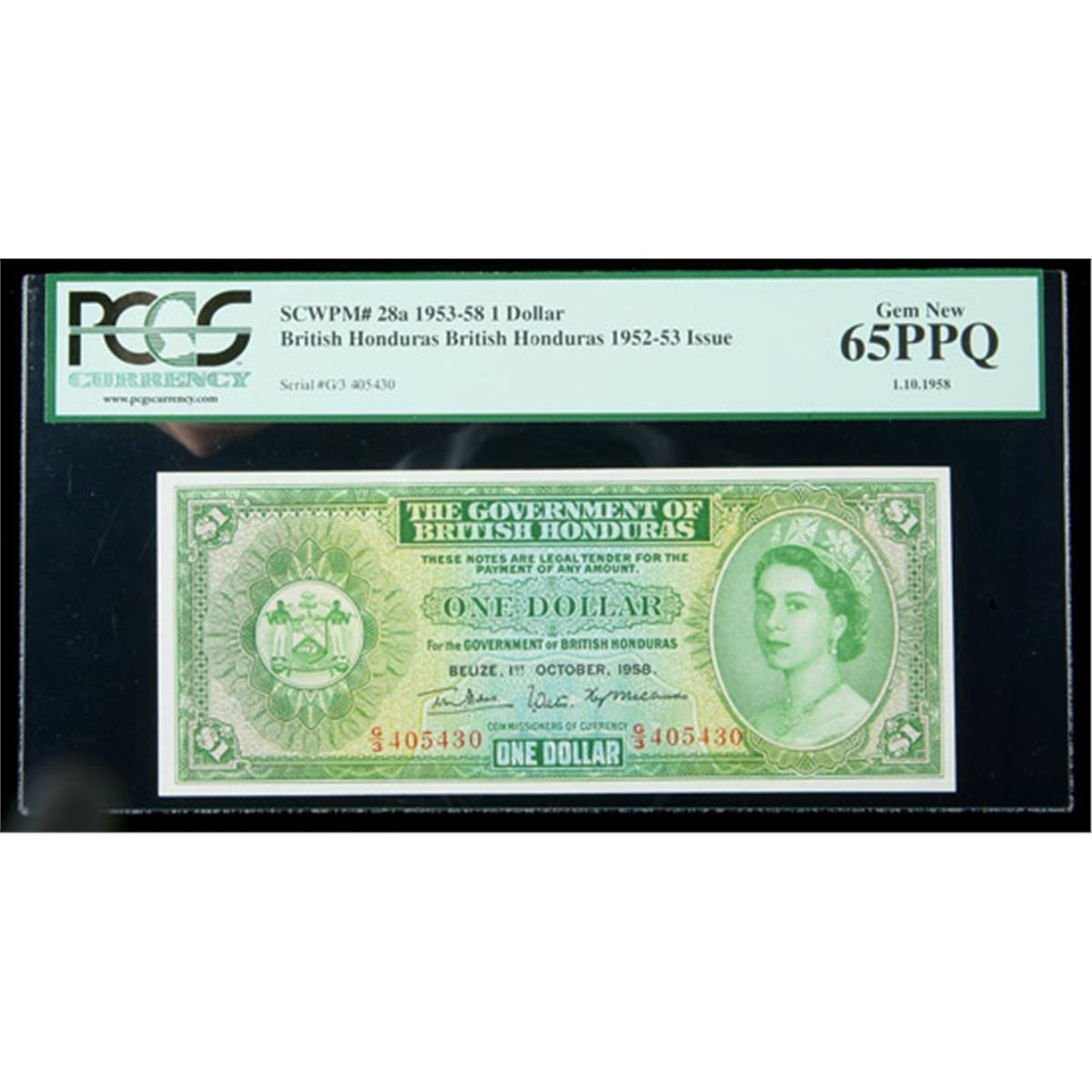 British Honduras SCWPM# 28a, 1.10.1958 1 Dollar. PCGS Gem New 65PPQ. . Fr-P-28a. A lovely Gem example of a scarcer early QE2 issue. Flawless in every way, with great colors and bold originality and embossing.