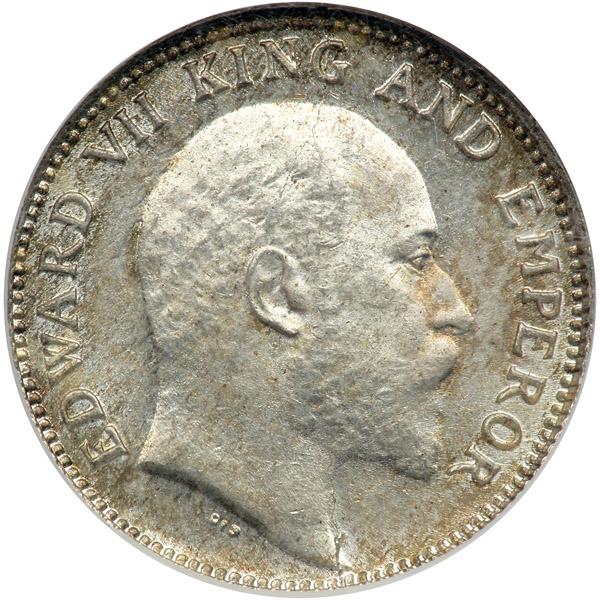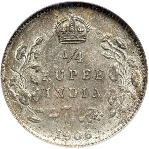 British India. ¼ Rupee, 1906-C. Prid-435; KM-506. Edward VII. Bare head right. Reverse: Value and country between floral sprays, crown above, date below. Toned. NGC graded MS-63.