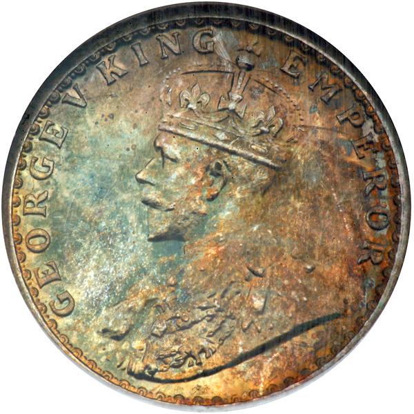 British India. ¼ Rupee, 1917-C. Prid-446; KM-518. Restrike. George V. Crowned bust left. Reverse: Value, country and date within floral border. Toned. NGC graded MS-64 Prooflike.