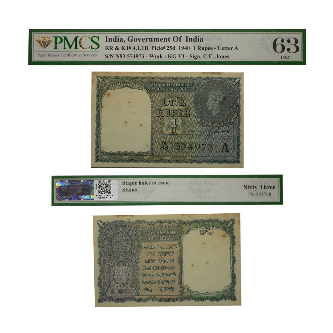 British India, 1 Rupee, 1940, N83 574973, Letter A, Signed by C.K. Jones, Graded by PMCS as 63.