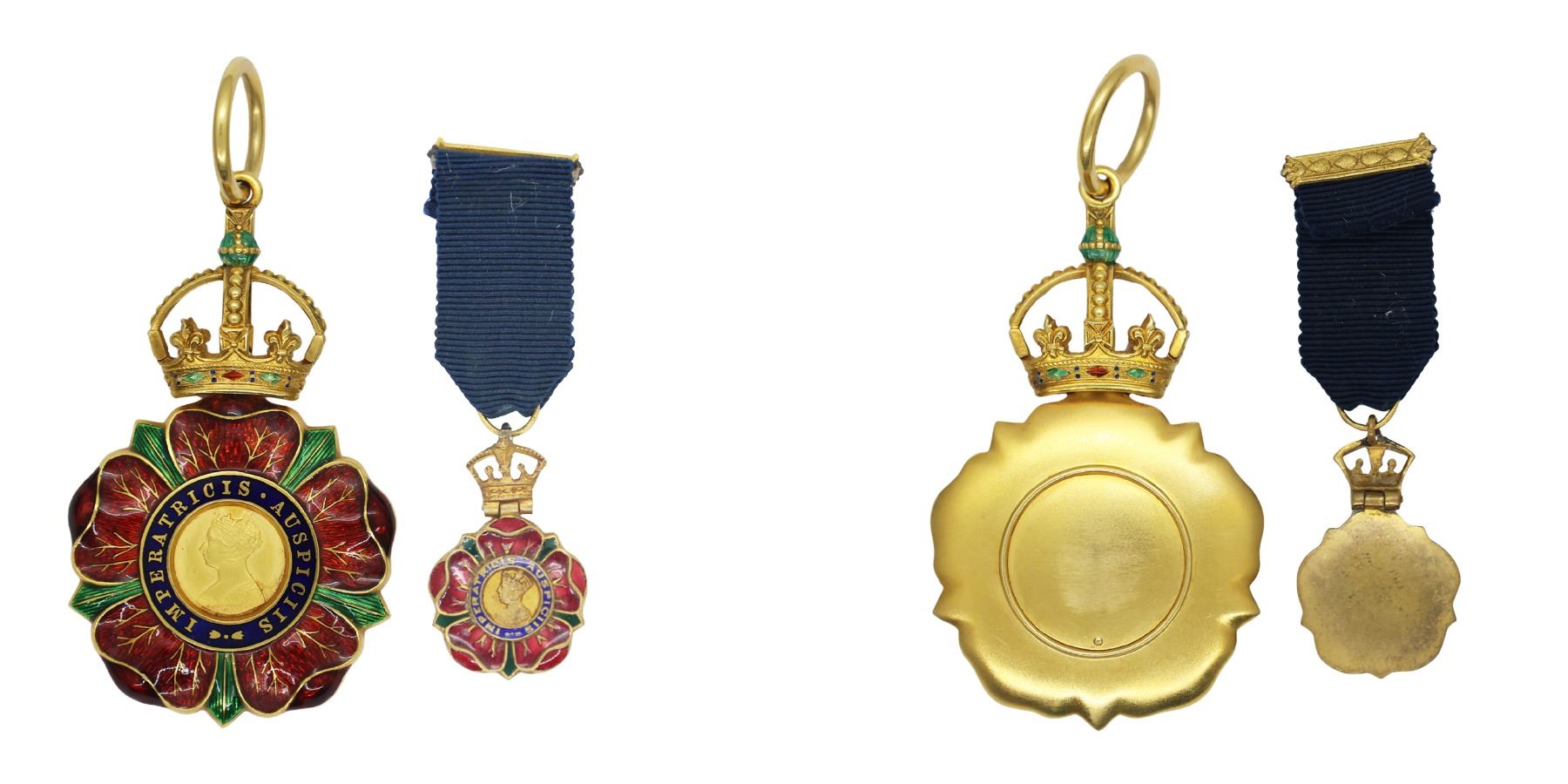 British India, Medal and its Miniature (Pair)1878: The Most Eminent Order of the Indian Empire, C.I.E., Instituted in 1878. In Gold with red, green and blue enamels, weigh: 27.39 grams, inclusive of its integral ring, intact enamels, on its full-length original neck ribbon, extremely fine. In its hard-shelled case of issue, marked "C. I. E." on the lid, maker marked "GARRARD & amp; Co Ltd" on the inside lid, raised platform with recessed medal bed, case also extremely fine, , Extremely Rare.Miniature Medal: The Most Eminent Order of the Indian Empire, C.I.E., Companion's 2nd type badge, silver-gilt and enamel, with integral top brooch bar.Miniature medal - 6.56gm (weight with ribbon). with caseOffered as a pair for very 1st time in any public auction in India.Footnote: The Most Eminent Order of the Indian Empire is an order of chivalry founded by Queen Victoria in 1878, to reward British and native officials who served in India. The Order was originally called the Order of the Indian Empire and had only one class (Companion) but expanded to comprise two classes in 1887. The British authorities intended the Order to be a less exclusive version of the Order of the Star of India (founded in 1861); consequently, many more appointments were made to the former than to the latter. On February 15, 1887, the Order of the Indian Empire formally became The Most Eminent Order of the Indian Empire and was divided into two classes: Knights Commander and Companions. It was later revised to include three classes: Knight Grand Commander (GCIE), Knight Commander (KCIE) and Companion (CIE). No appointments have been made since 1947, the year that India and Pakistan became independent from the British Raj. With the death of the last surviving knight, the Maharaja of Dhrangadhra, the order became dormant in 2010. The motto of the Order is "Imperatricis auspiciis" (Latin for "Under the auspices of the Empress"), a reference to Queen Victoria, the first Empress of India