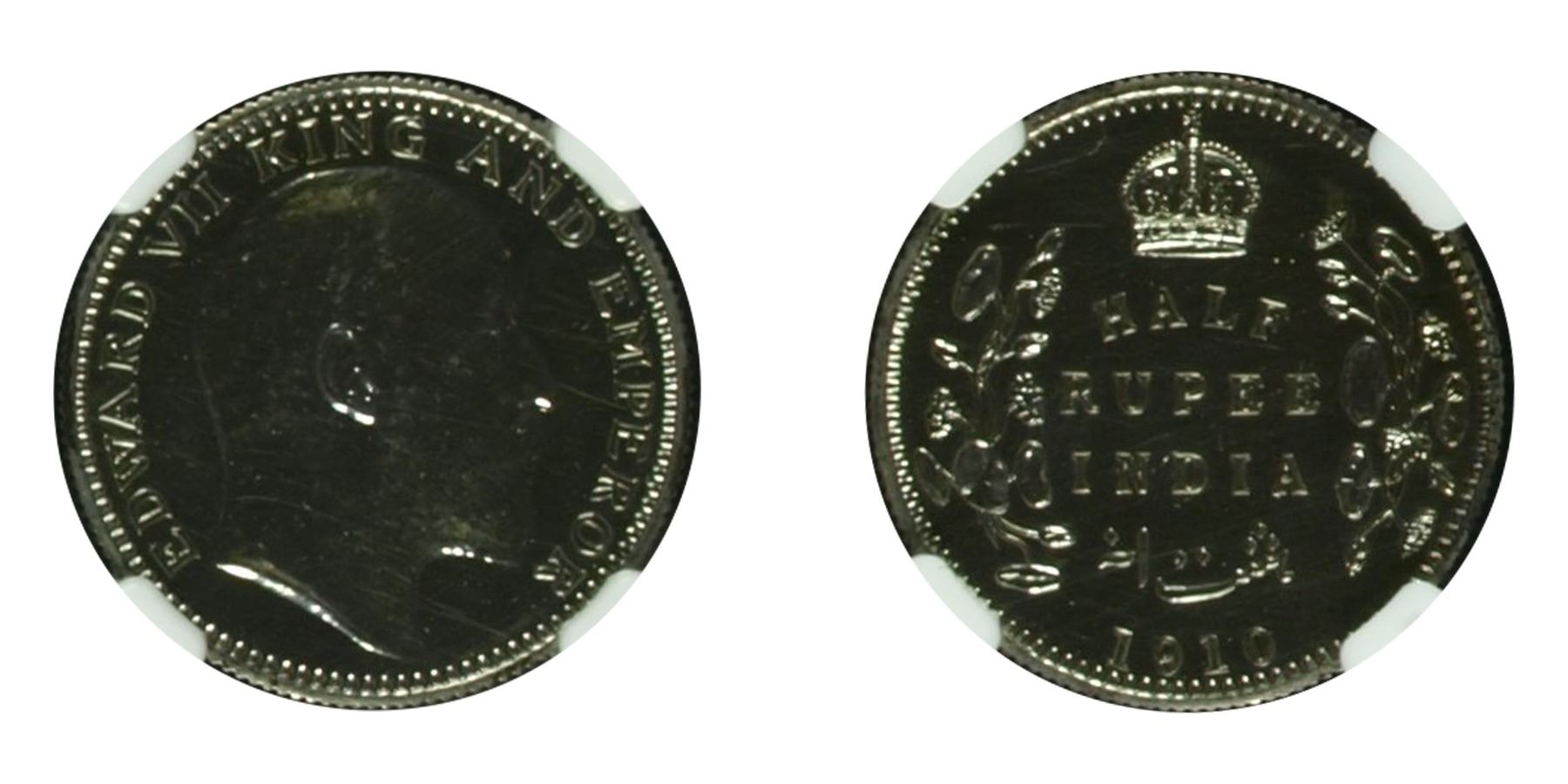 1910, King Edward VII, Silver ½ Rupee, Calcutta mint, no mint mark, Ex-David Fore Proof Restrike, SW 7.71, Lacquered and hairlined, brilliant UNC.& nbsp;Graded & amp; Slabbed by NGC PF 62.