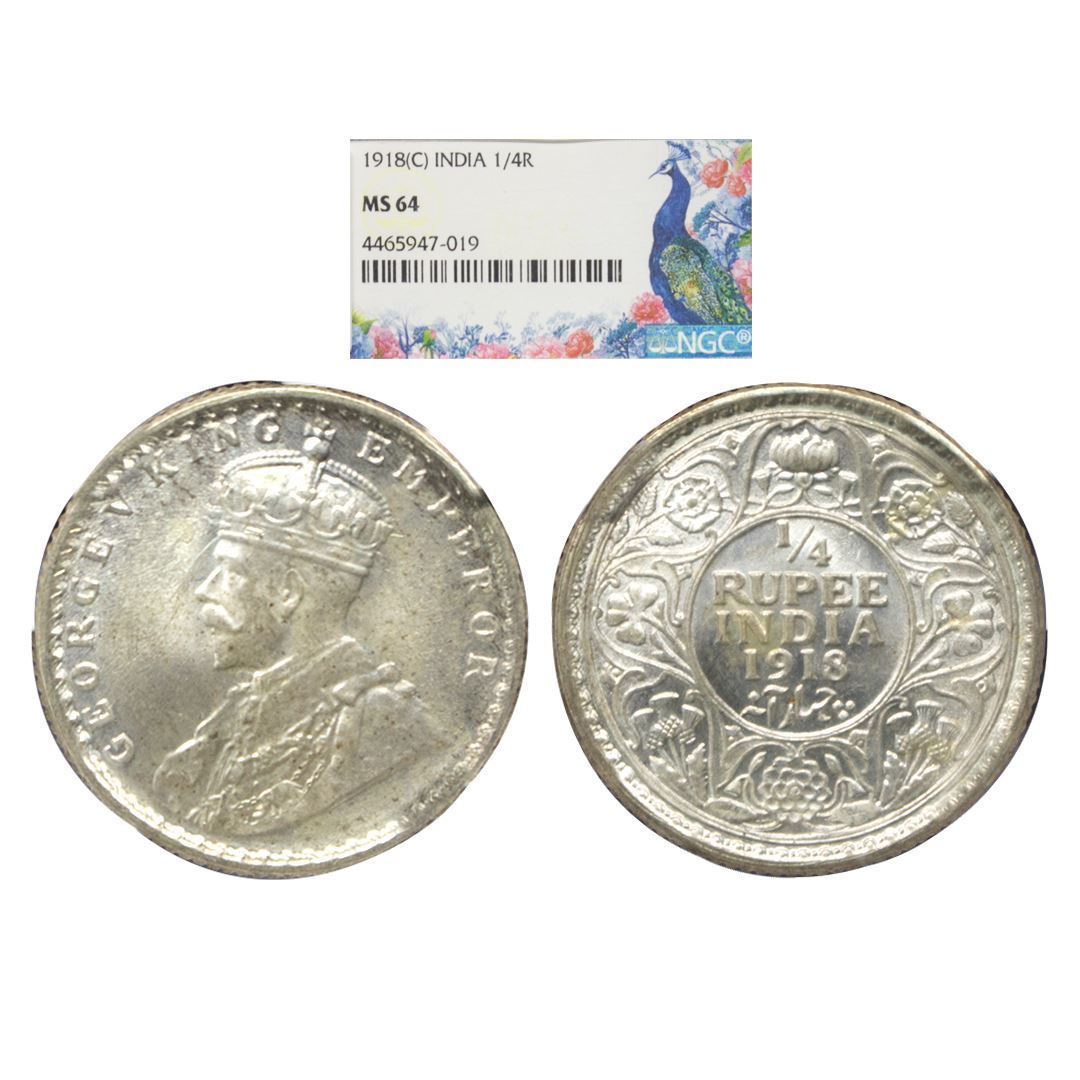 British India, George V (1910-1936 AD), Silver ¼ Rupee, Calcutta Mint, 1918, Key Prid # 447, Graded as MS 64 by NGC, rare.