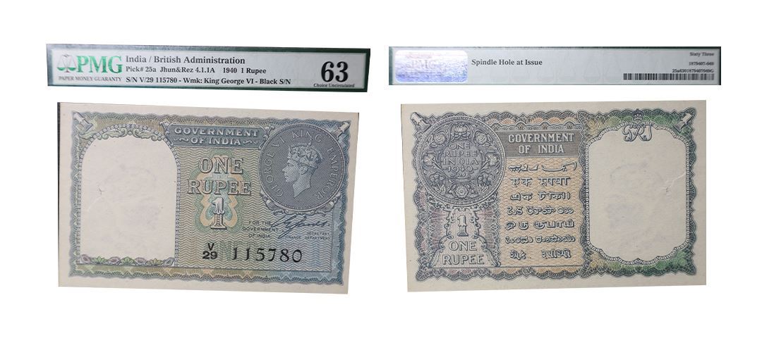 British India, George VI, 1 rupee, 1940, signed by C.E. Jones, without inset, serial no.: V29 115780 in black, J&R 4.1.1A. Graded as 63 Choice Uncirculated by PMG, Spindle Hole at Issue, Very scarce