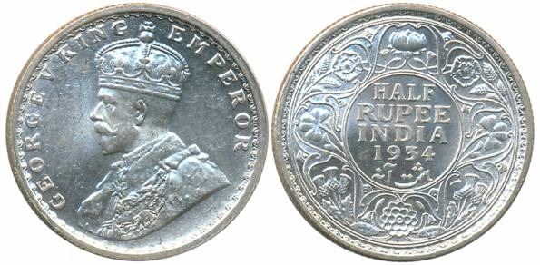 George V, Silver 1/2 Rupee, 1934, Calcutta Mint (Prid# 334). About uncirculated.
