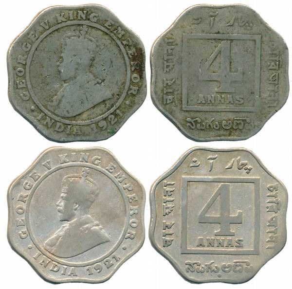 George V, Copper Nickel, 4 Anna (2), 1921, Bombay Mint (Prid# 879) & Calcutta Mint (Unlisted in Pridmore). Fine to about very fine, rare. 2 coins.