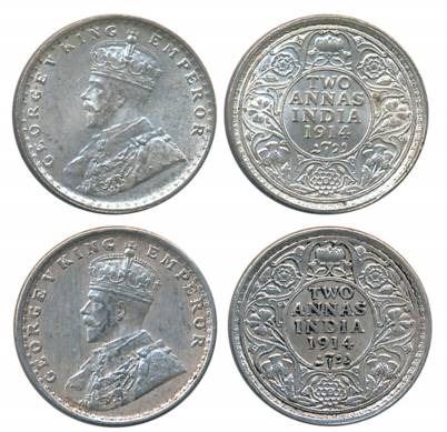 George V, Silver 2 Annas (2), 1914, Calcutta Mint & Bombay Mint (Prid# 567, 573). Extremely fine to about uncirculated. 2 coins.