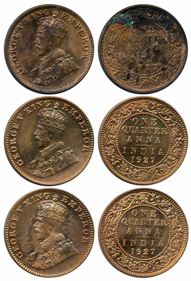 George V, Bronze 1/4 Anna (3), 1927, Calcutta Mint (1) (Prid# 668) & Bombay Mint (2 different variety) (Prid# 680 & Unlisted in Pridmore). About extremely fine to uncirculated. 3 coins.