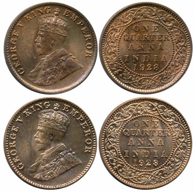 George V, Bronze 1/4 Anna (2), 1928, Calcutta Mint (Prid# 669) & Bombay Mint (Prid# 681). About uncirculated. 2 coins.
