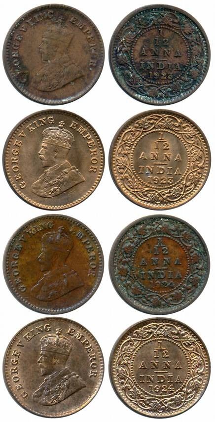 George V, Copper 1/12 Anna (4), 1923, Calcutta Mint (Prid# 837), Bombay Mint (Prid# 851) & 1924, Calcutta Mint (Prid# 838), Bombay Mint (Prid# 852). Extremely fine to about uncirculated. 4 coins.