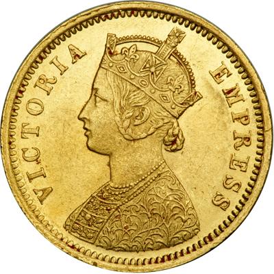British India. Mohur, 1879. Fr-1604; KM-496. Victoria. Young bust left with the title of Empress. Reverse: Value and date. NGC graded MS-61.