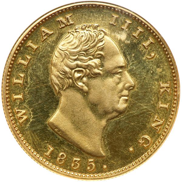 British India. Restrike Gold 2 Mohur, 1835-C. Prid-3; Fr-1592b; KM-452.1. East India Company. William IV. Bare head right. Reverse: Lion left. Rare. NGC graded Proof 64 Cameo.