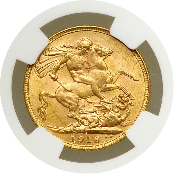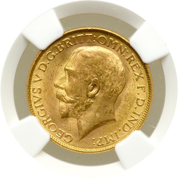 British India. Sovereign, 1918-I. Fr-1609; KM-525A. Weight 0.2355 ounce. George V. One year type. NGC graded MS-63.