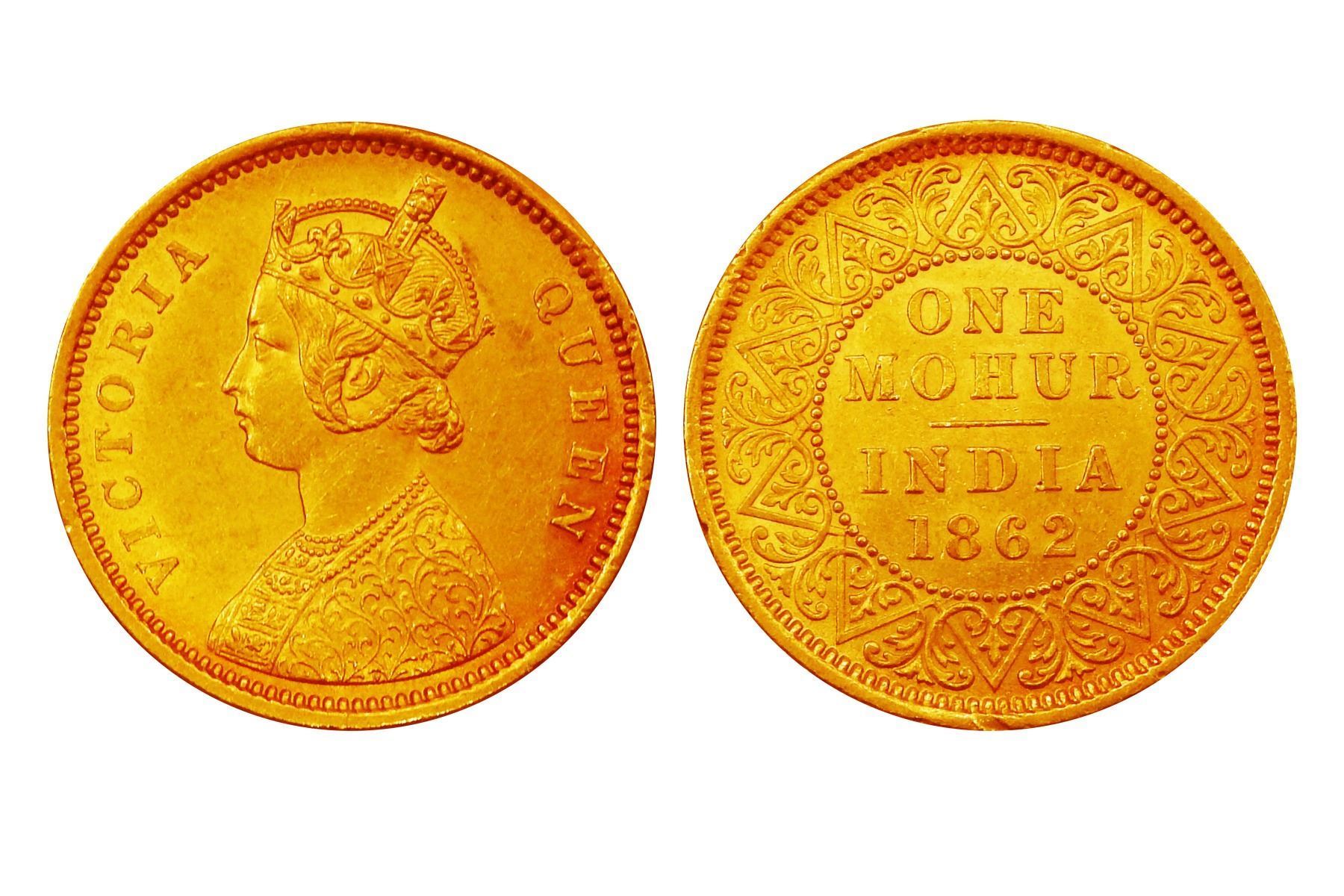 British India, Victoria Queen, Gold Mohur, 1862, Calcutta Mint, Obverse: Crowned and robed bust to the left and in divided legend Victoria Queen, Reverse: One Mohur, India, 1862 within a beaded circle, outside the circle and within a beaded rim a ten pointed star with entwined scroll work, Type 5 as per pridmore, A remarkable and rare die variety, this coin exhibits features from both Verity 3 and Verity 4, making it a highly desirable and unusual piece for advanced collectors. O: Features a single flower in the bottom panel of the jabot, a key marker of the variety. Uniquely, a tiny "V" is visible in the relief at the center of the bust, precisely on the line of truncation—an uncommon detail that sets it apart from typical issues. R: While the reverse appears normal at first glance, close examination reveals a small "V" in the relief on the ornamental element within the outer circle, directly beneath the date—a second subtle yet significant feature. Almost Uncirculated, Exceedingly rare.