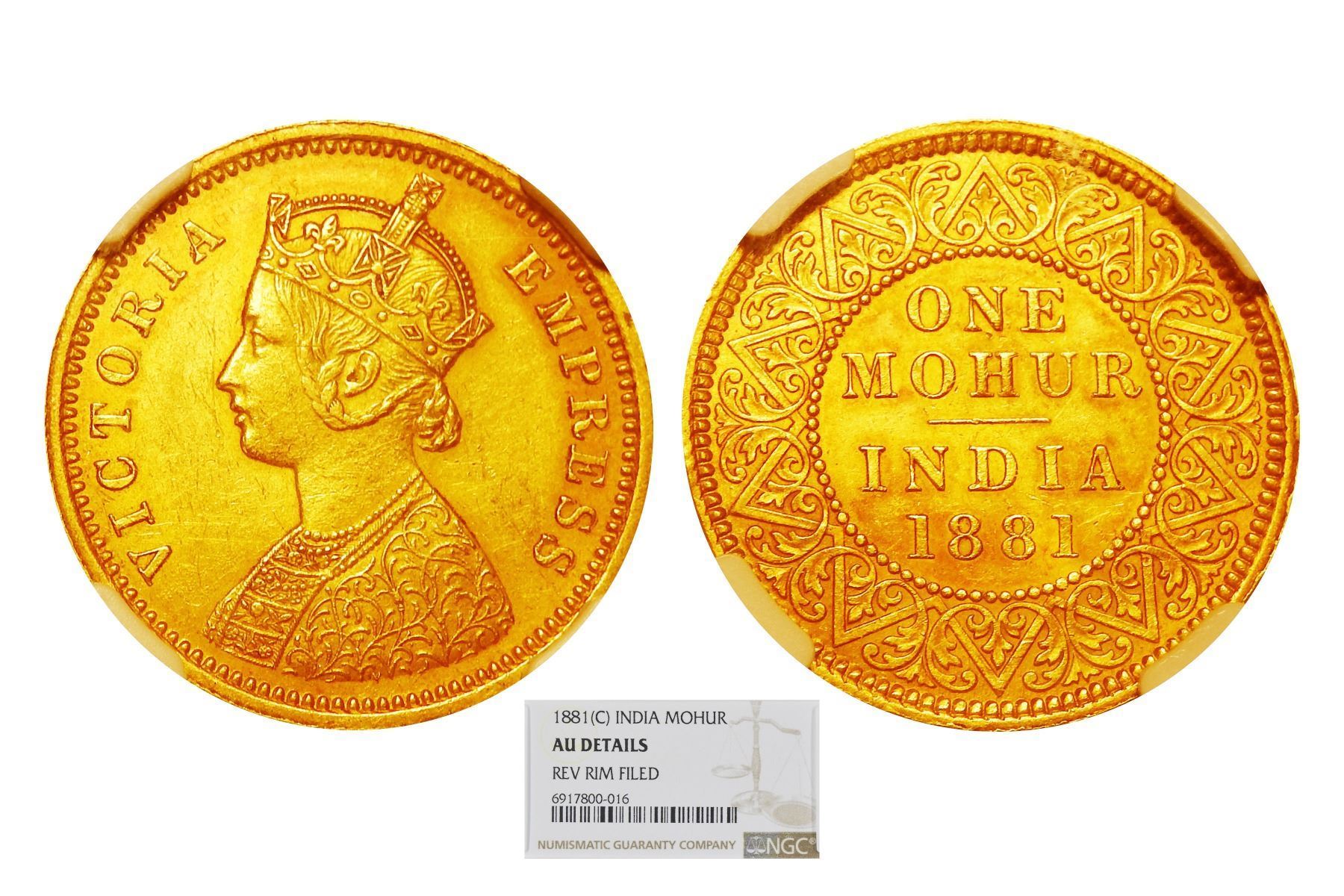British India, Victoria Empress, Gold Mohur, 1881, Calcutta Mint, Graded Almost Uncirculated Details by NGC, this coin is a true rarity despite not being in mint state. As recorded by Pridmore, only 22,647 coins were ever minted, making it an exceptionally scarce issue. The coin retains strong detail with minimal wear, and while NGC has noted a minor issue, it remains highly appealing and desirable. Very few examples surface on the market, especially in such well-preserved condition. For collectors of British India or colonial coinage, this is a rare opportunity to acquire a low-mintage, historically significant coin, certified and secured in an NGC holder.