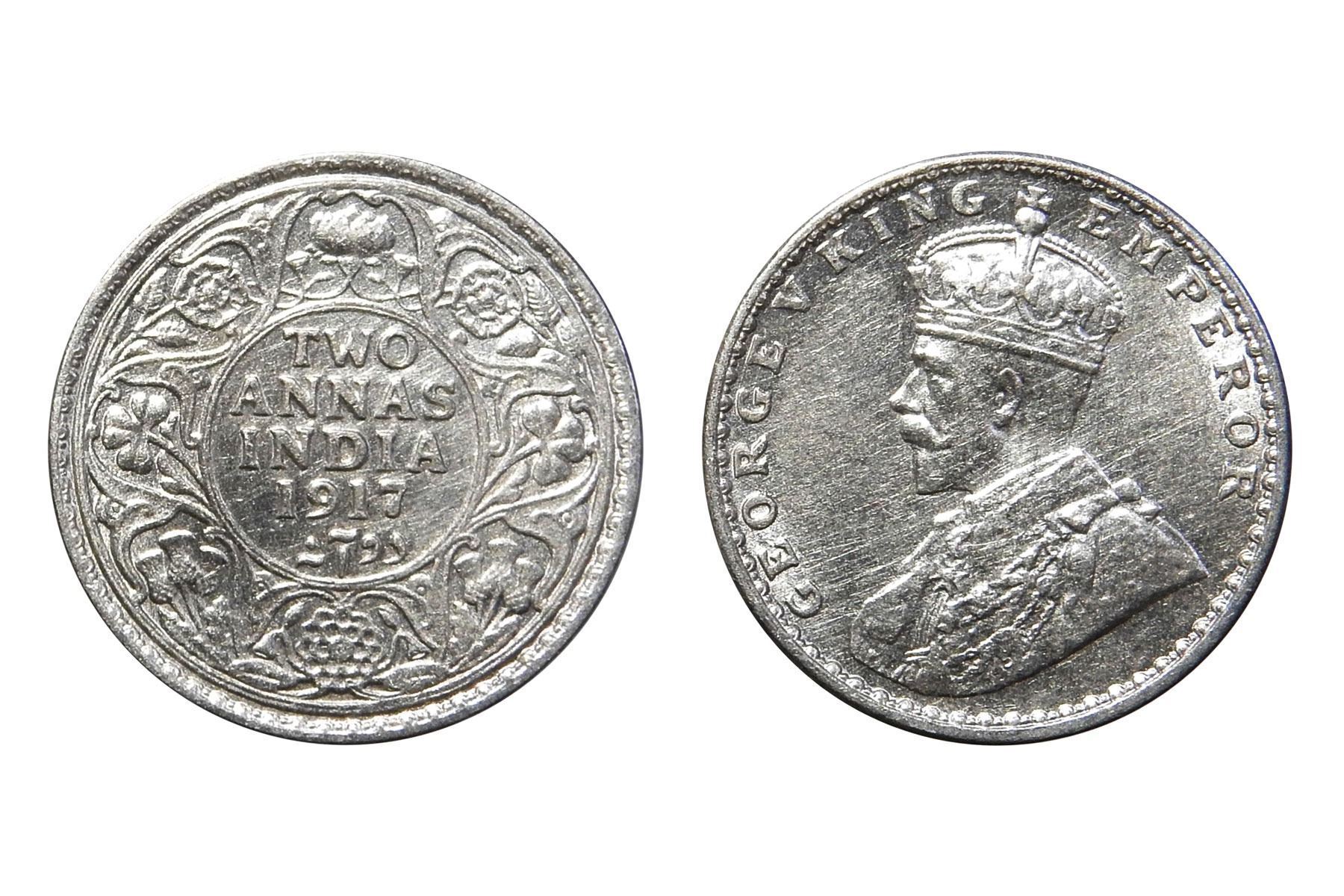 British India, George V (circa 1858–1947 CE), Silver Two Annas weighing 1.40 grams, minted at Calcutta